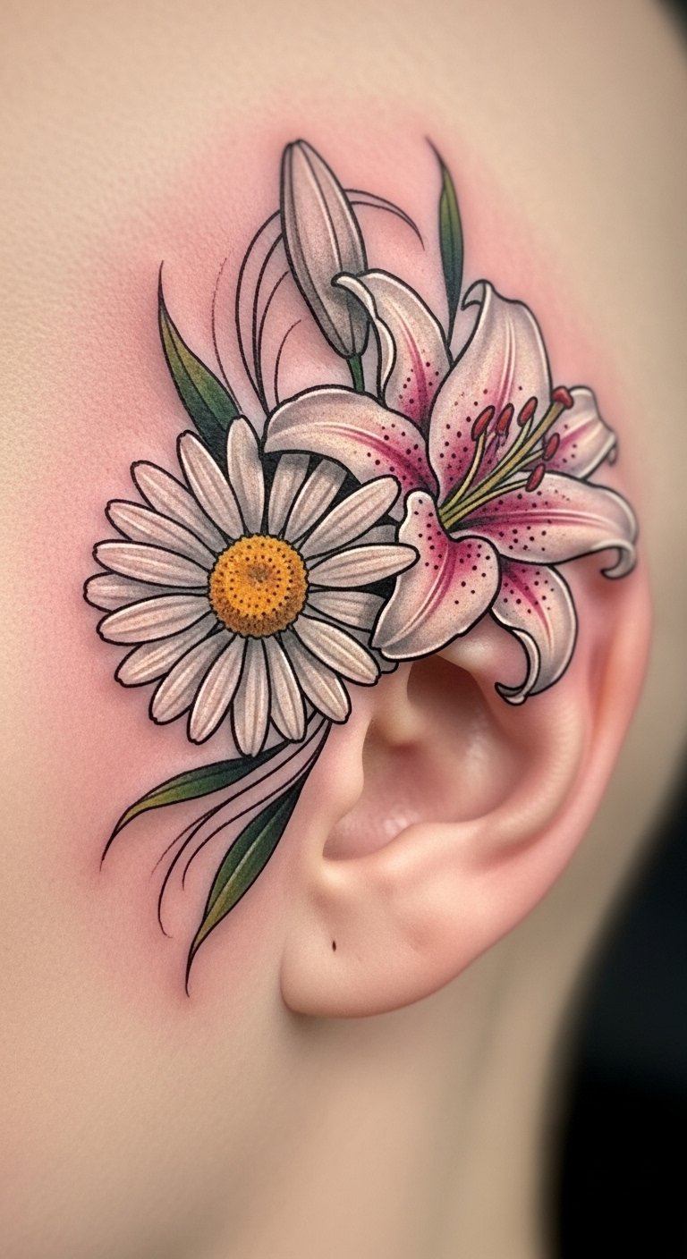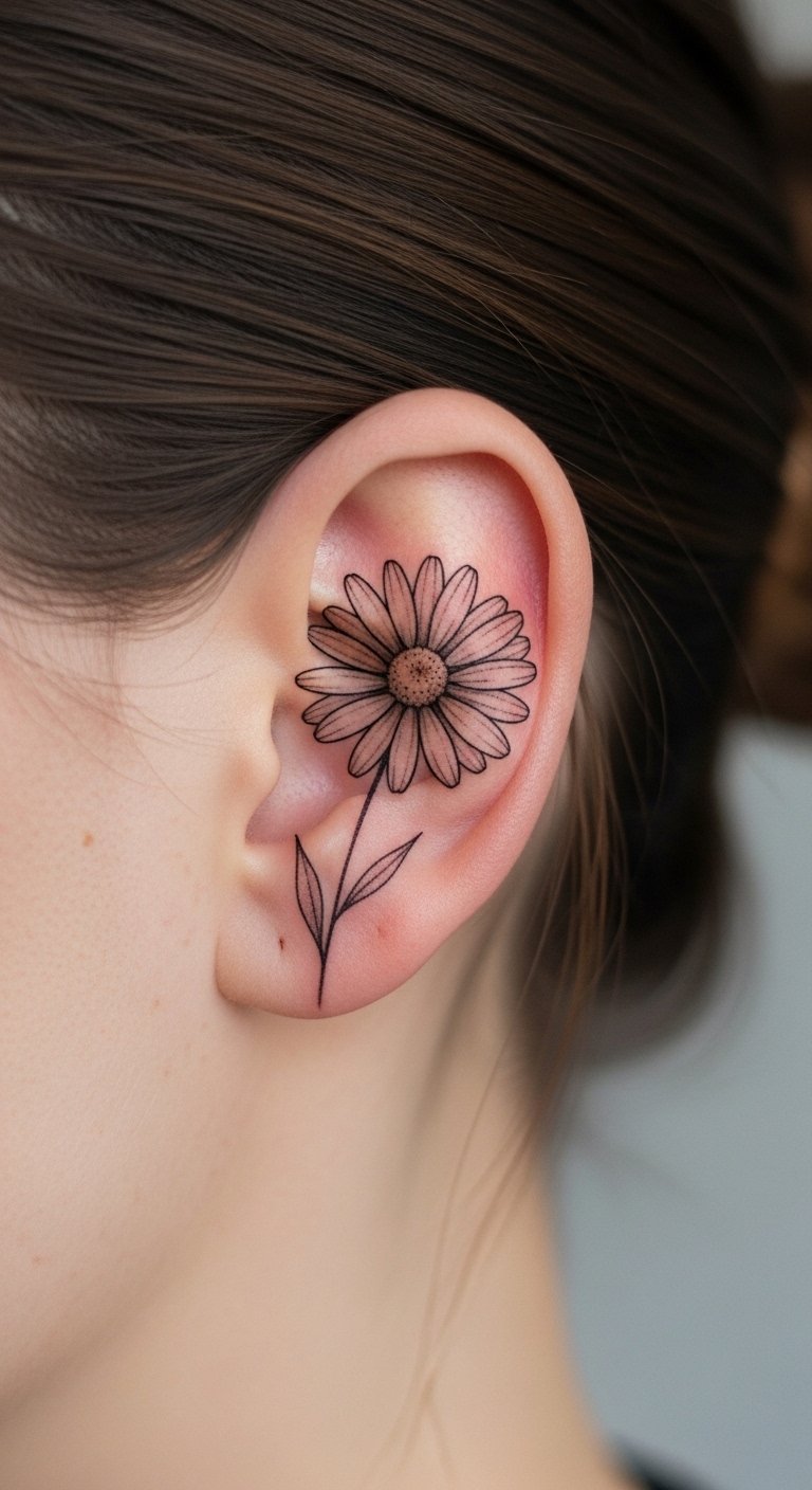 This daisy tattoo behind the ear symbolizes a journey of renewal and innocence, serving as a charming reminder of hope and new beginnings.