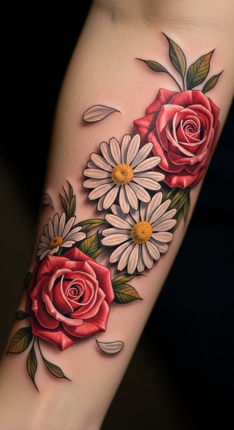 This tattoo symbolizes the delicate balance of love and strength, with the daisies representing purity and the roses embodying passion.
