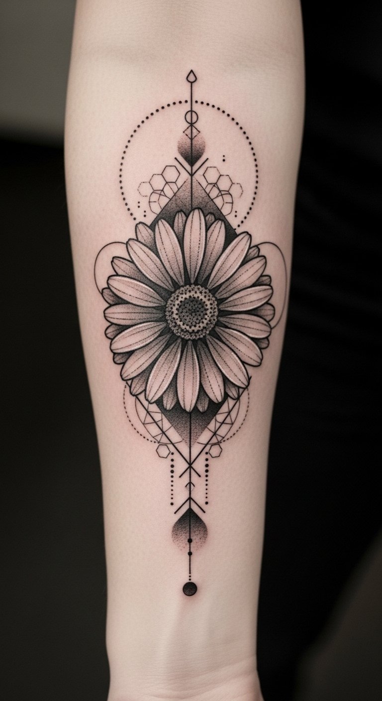The geometric daisy tattoo symbolizes the balance between nature and modernity, representing individuality and creativity.