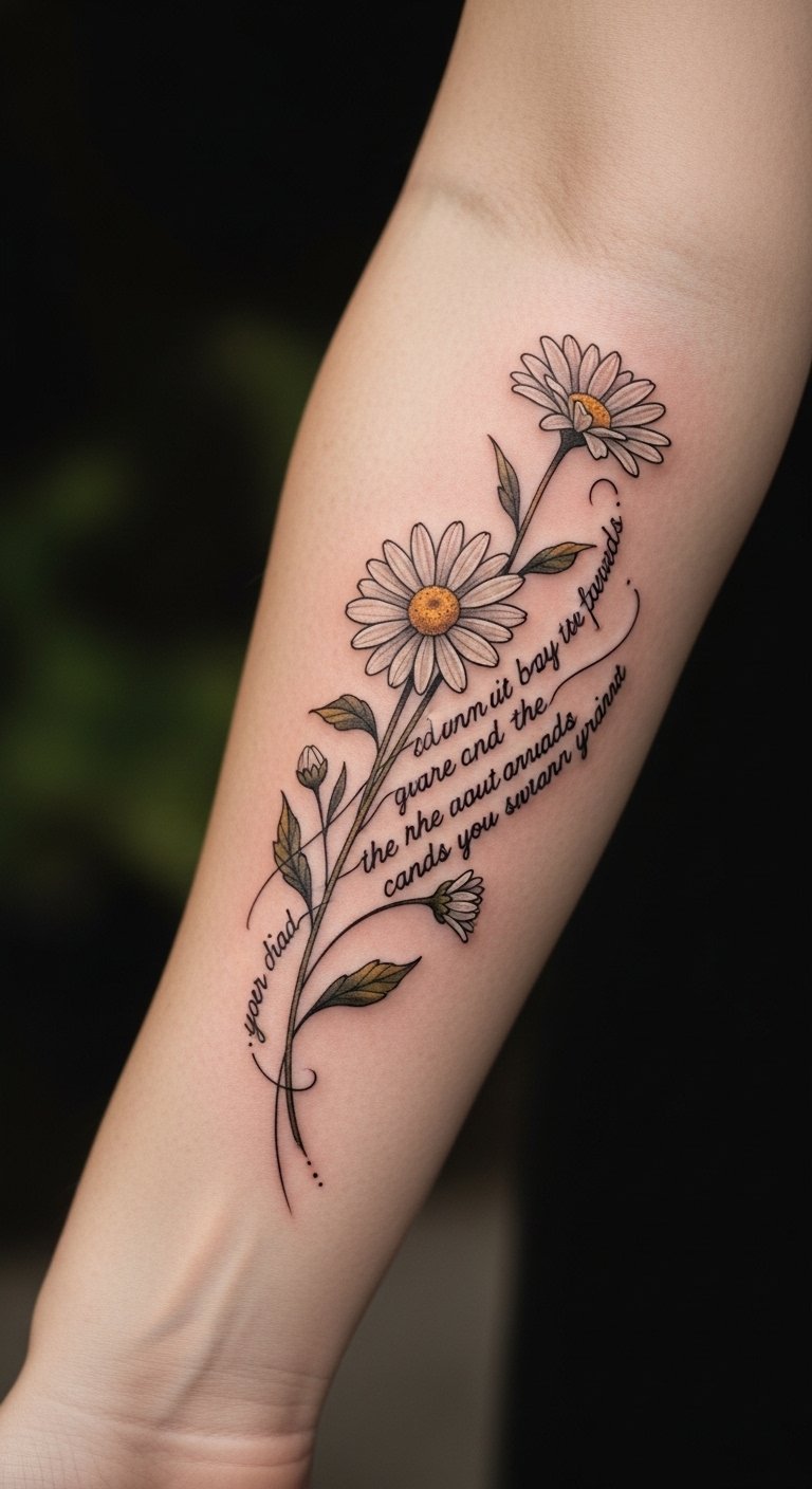 The combination of daisies and an inspirational quote on the forearm serves as a constant reminder of purity and new beginnings, reflecting personal resilience and hope.