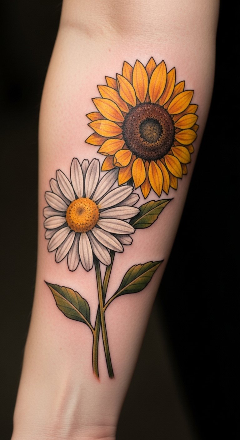 This tattoo symbolizes purity and new beginnings through the daisy while the sunflower represents adoration and loyalty.