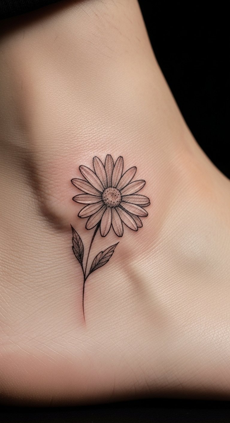 The delicate daisy tattoo on the ankle symbolizes purity and new beginnings, serving as a reminder of personal growth and freedom.