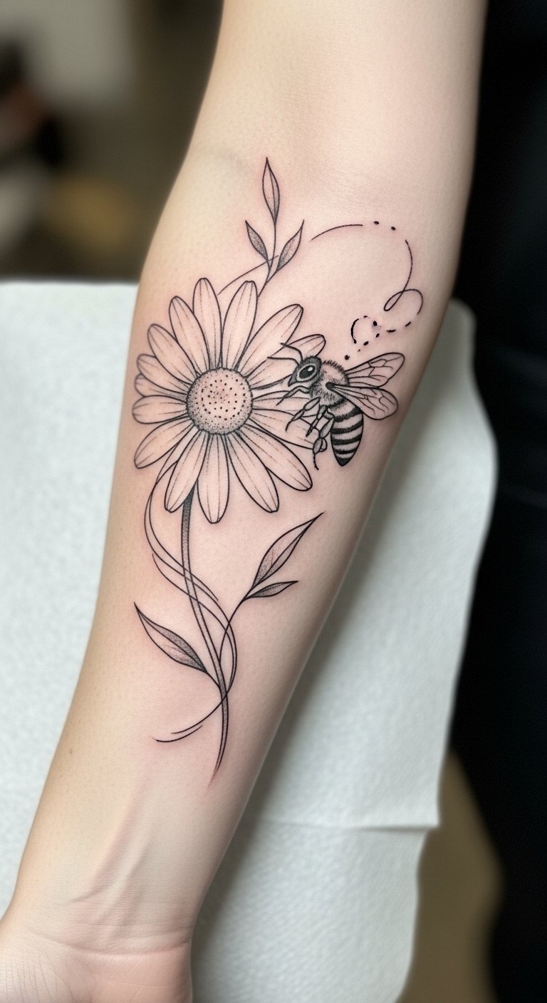 This tattoo design captures the essence of nature’s beauty, intertwining the purity of the daisy with the industrious spirit of the bee.
