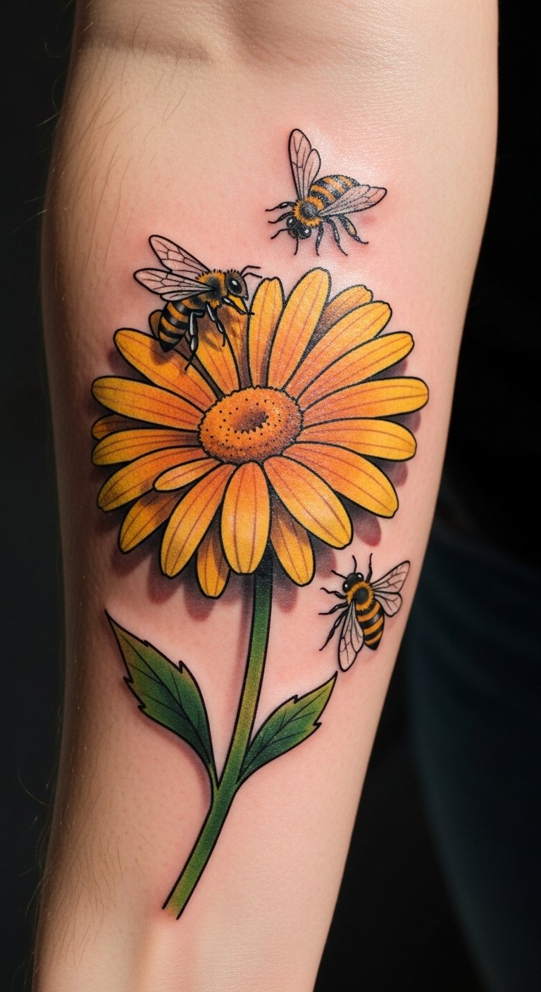 This tattoo symbolizes beauty and resilience, with daisies representing purity and new beginnings, while bees signify hard work and community.