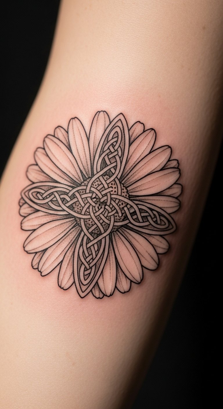 This tattoo design symbolizes the intertwining of life’s beauty and resilience, merging the charm of daisies with the rich cultural heritage of Celtic and Norse traditions.