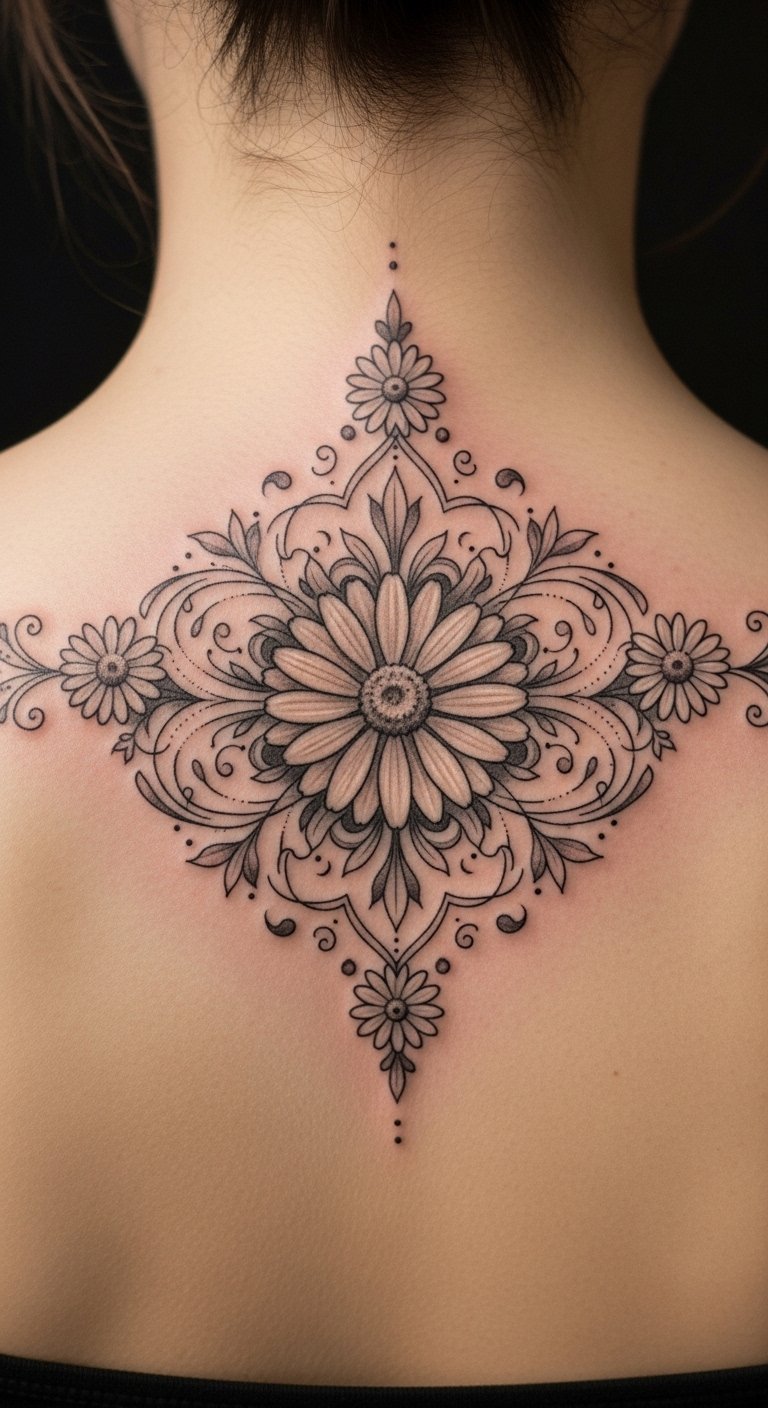 This large daisy tattoo on the upper back symbolizes purity, renewal, and resilience, embodying the essence of fresh starts in life.