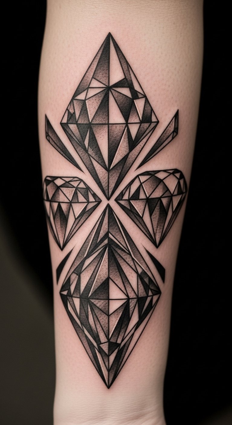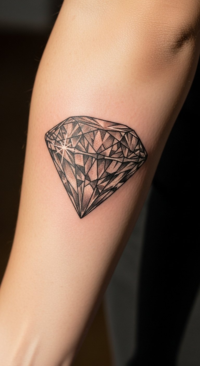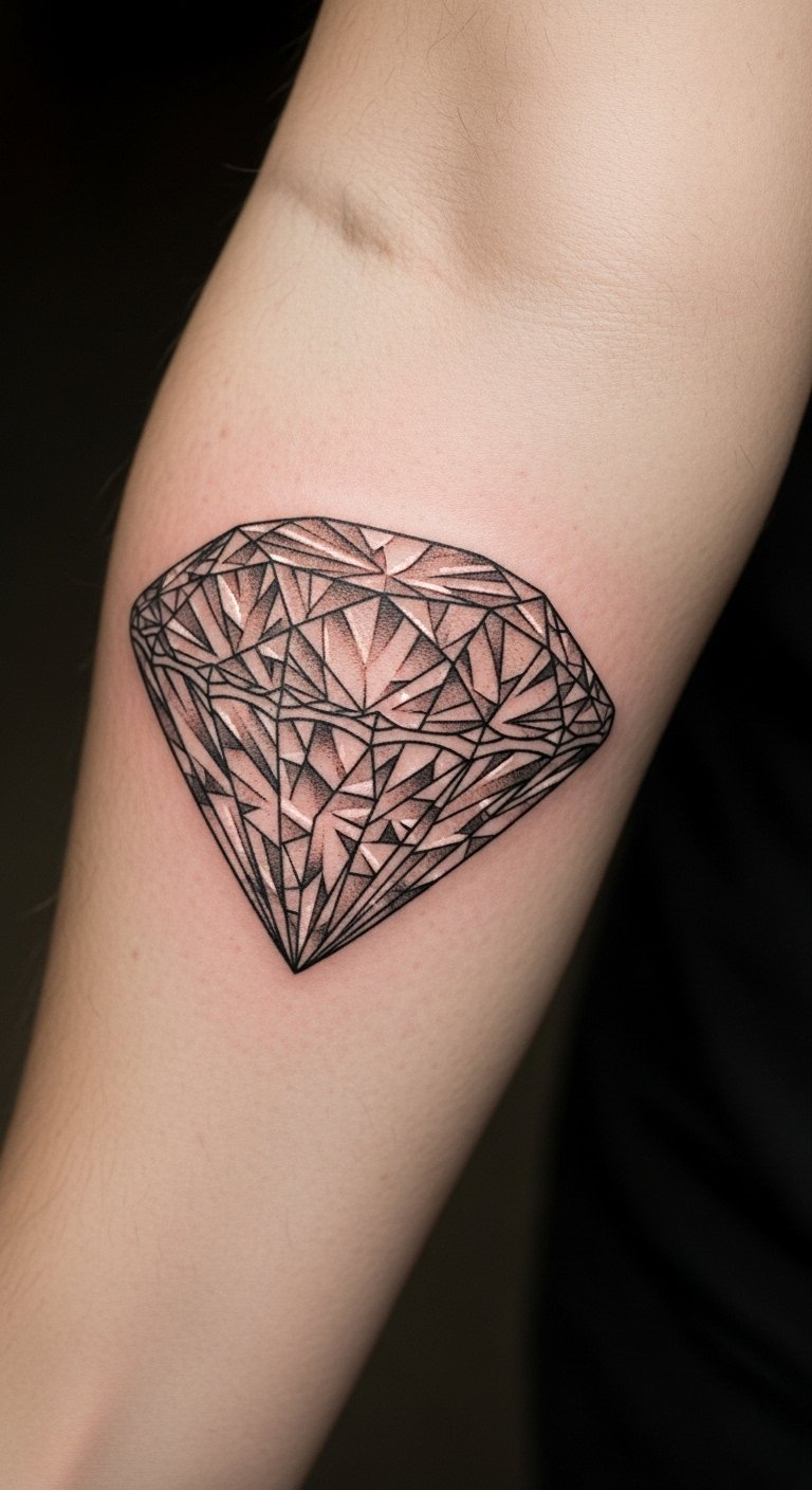 The diamond tattoo on the forearm symbolizes strength, clarity, and individuality, reflecting the wearer’s unique style and identity.