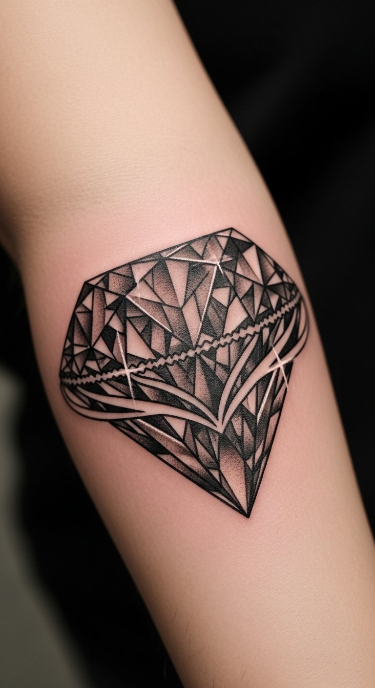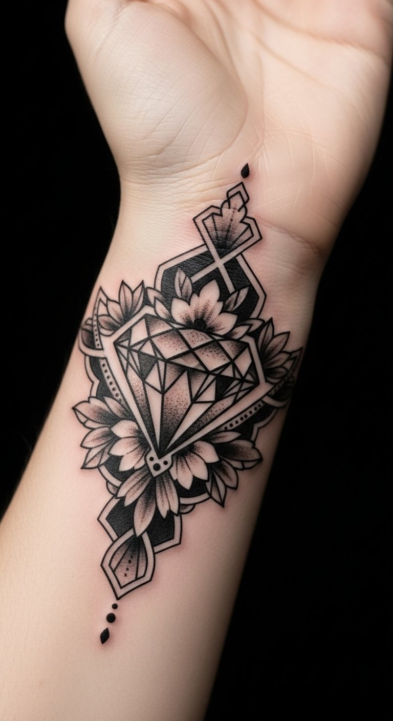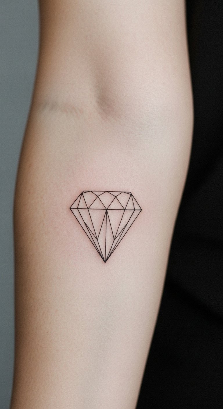The diamond tattoo on the forearm symbolizes strength, clarity, and individuality, reflecting the wearer’s unique style and identity.