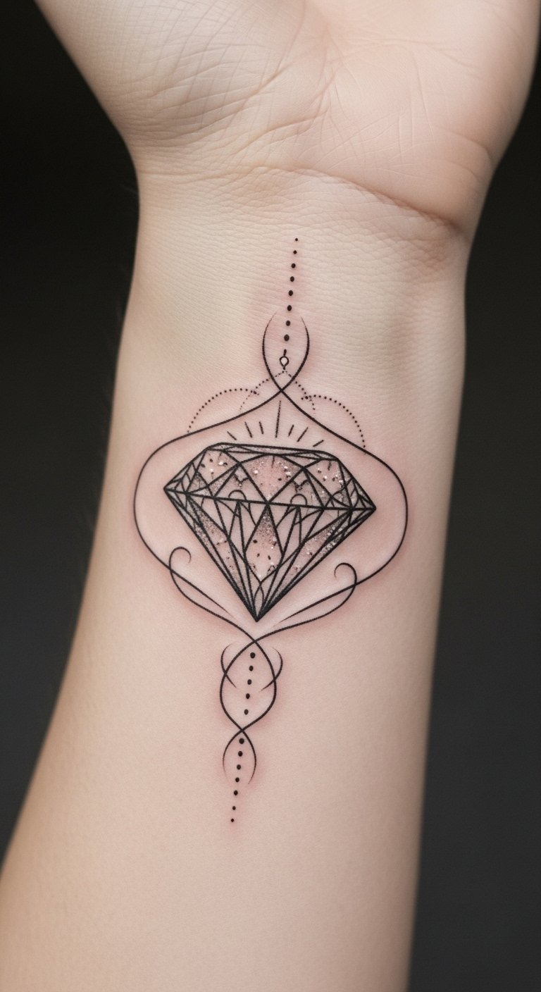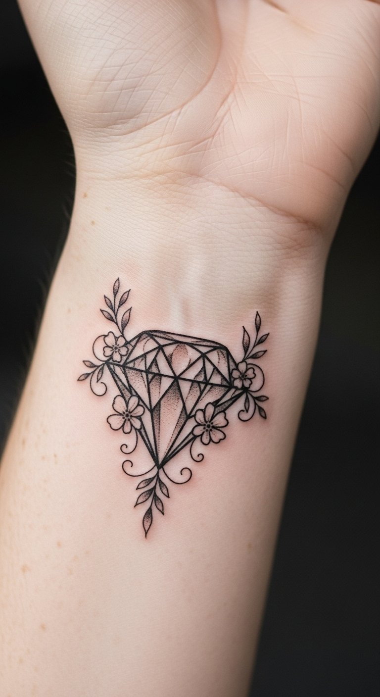 This diamond tattoo on the wrist serves as a constant reminder of love, commitment, and personal strength.