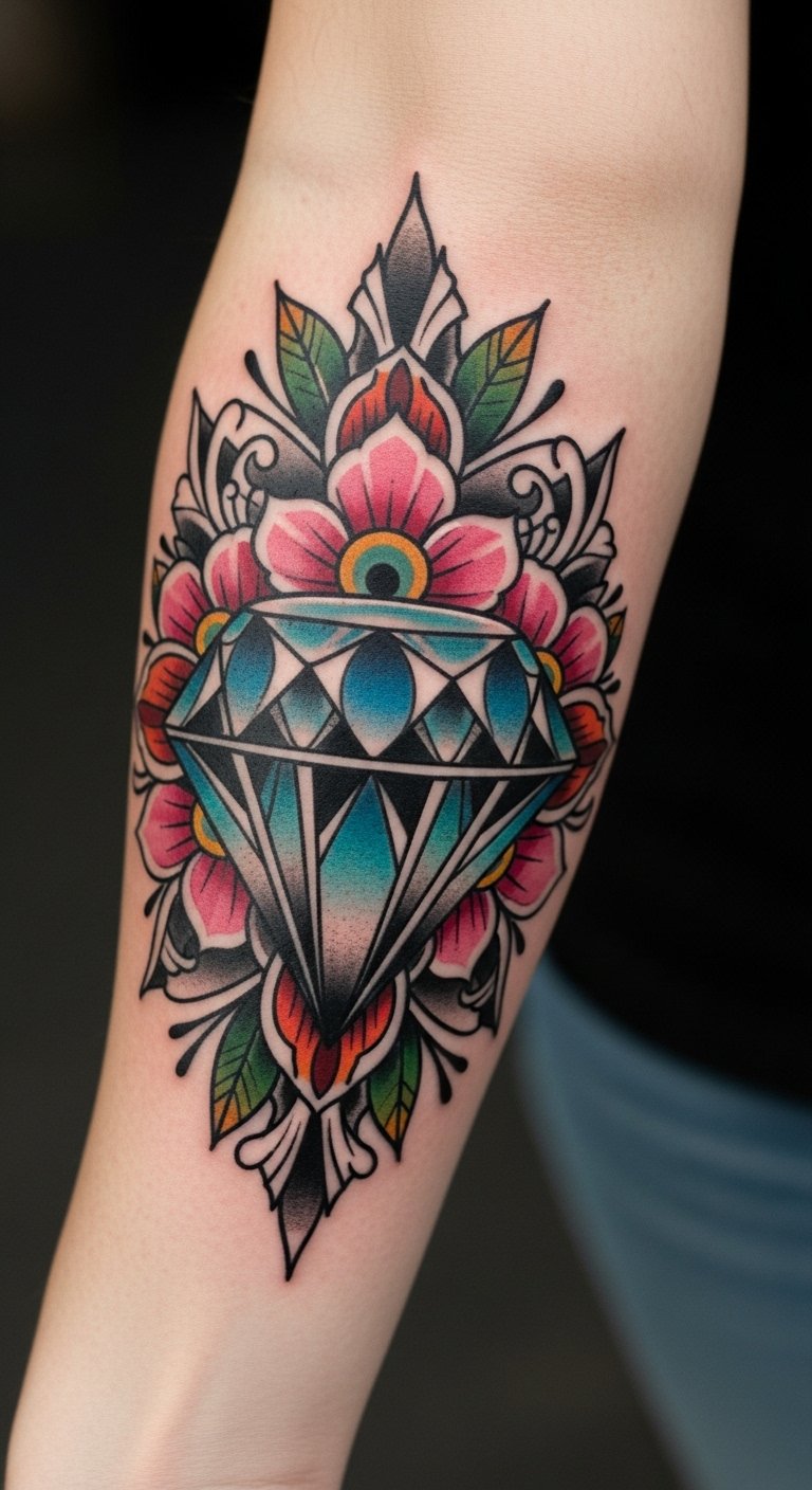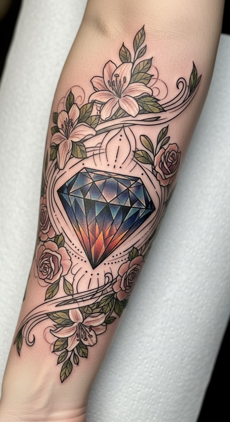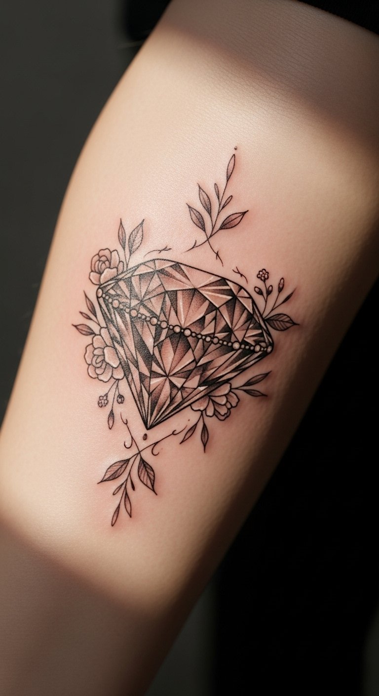 The diamond symbolizes the ability to withstand pressure and emerge radiant, while the floral elements signify growth and beauty. Together, they embody a balance of toughness and grace, making this tattoo not just an adornment but a powerful affirmation of personal strength.