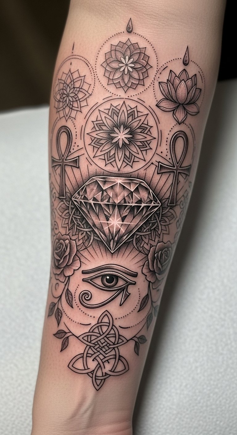 The tattoo embodies the ancient Indian belief in diamonds as protective gemstones, symbolizing divine safeguarding and spiritual significance.