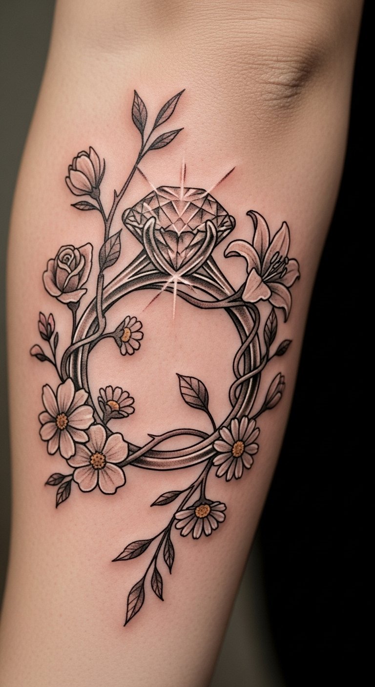 Placed on the forearm, it serves as a constant reminder of love’s resilience and the journey shared between partners. The surrounding floral elements add a touch of softness, contrasting with the diamond’s strength, reinforcing the idea that true connection transcends time and circumstance.