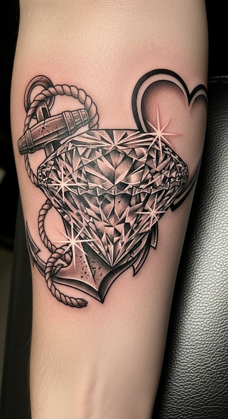 The diamond represents strength and resilience, while the anchor symbolizes grounding and security. The heart adds an element of affection and connection, making the piece a profound representation of the wearer’s personal story.