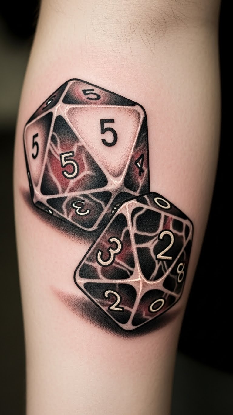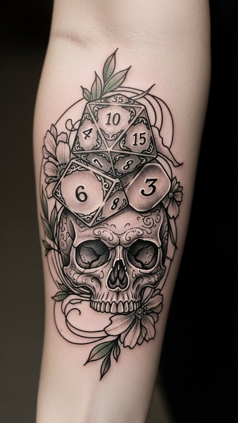 This tattoo symbolizes the interplay between chance and mortality, capturing the essence of life’s unpredictability.
