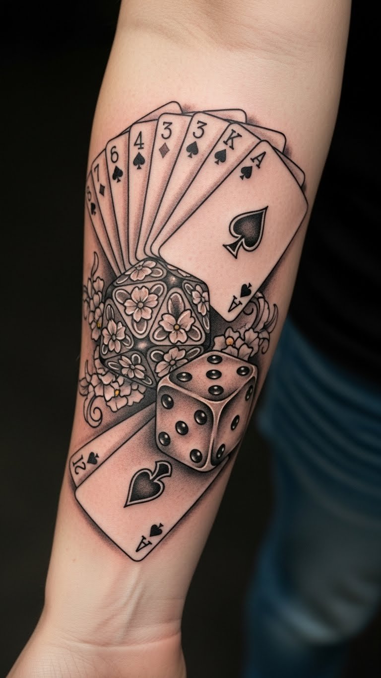 Positioned on the forearm, it allows for visibility, inviting conversation and reflection on the adventurous spirit and bold choices of the wearer. The combination of elements celebrates the rich history of gambling culture, making it a powerful statement about embracing risk and reward in life.