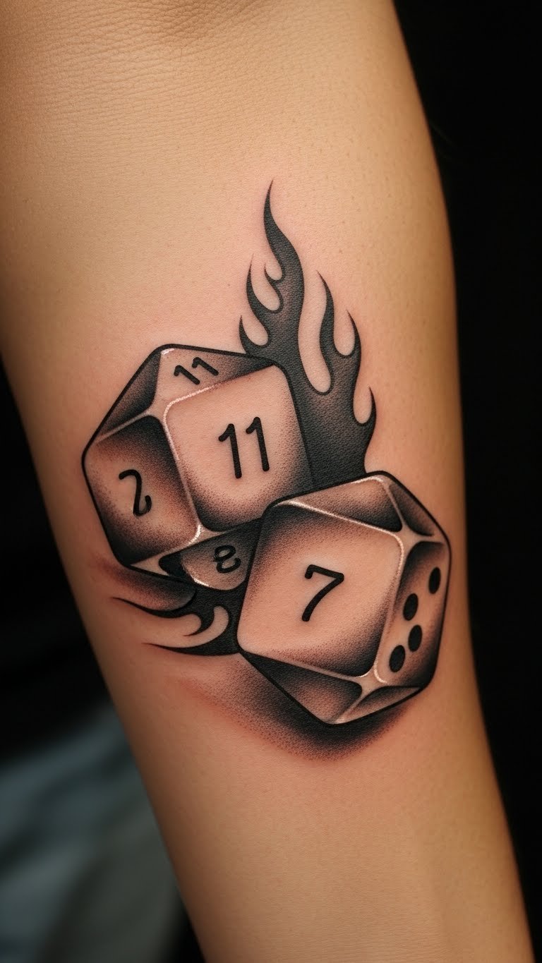 The flames surrounding the dice add an element of intensity and passion, reflecting a vibrant personality. Positioned on the forearm, this design allows for visibility and self-expression, making it a constant reminder to embrace life’s playful spirit and the thrill of the unknown.