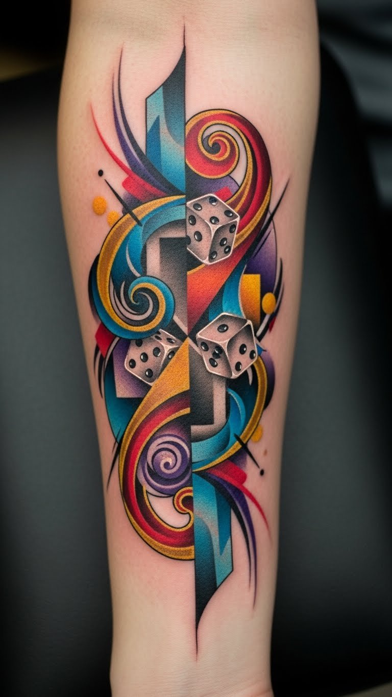 Positioned on the forearm, it serves as a constant reminder to embrace life’s unpredictability. The vibrant colors symbolize joy and a zest for life, while the dice themselves represent risk-taking and the thrill of new experiences.