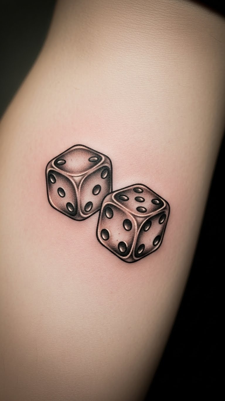 The dice symbolize both fortune and the potential for change, inviting reflection on the balance of luck and decision-making in life. The intricate details and shading create a lifelike appearance, enhancing the emotional connection to the tattoo’s meaning.
