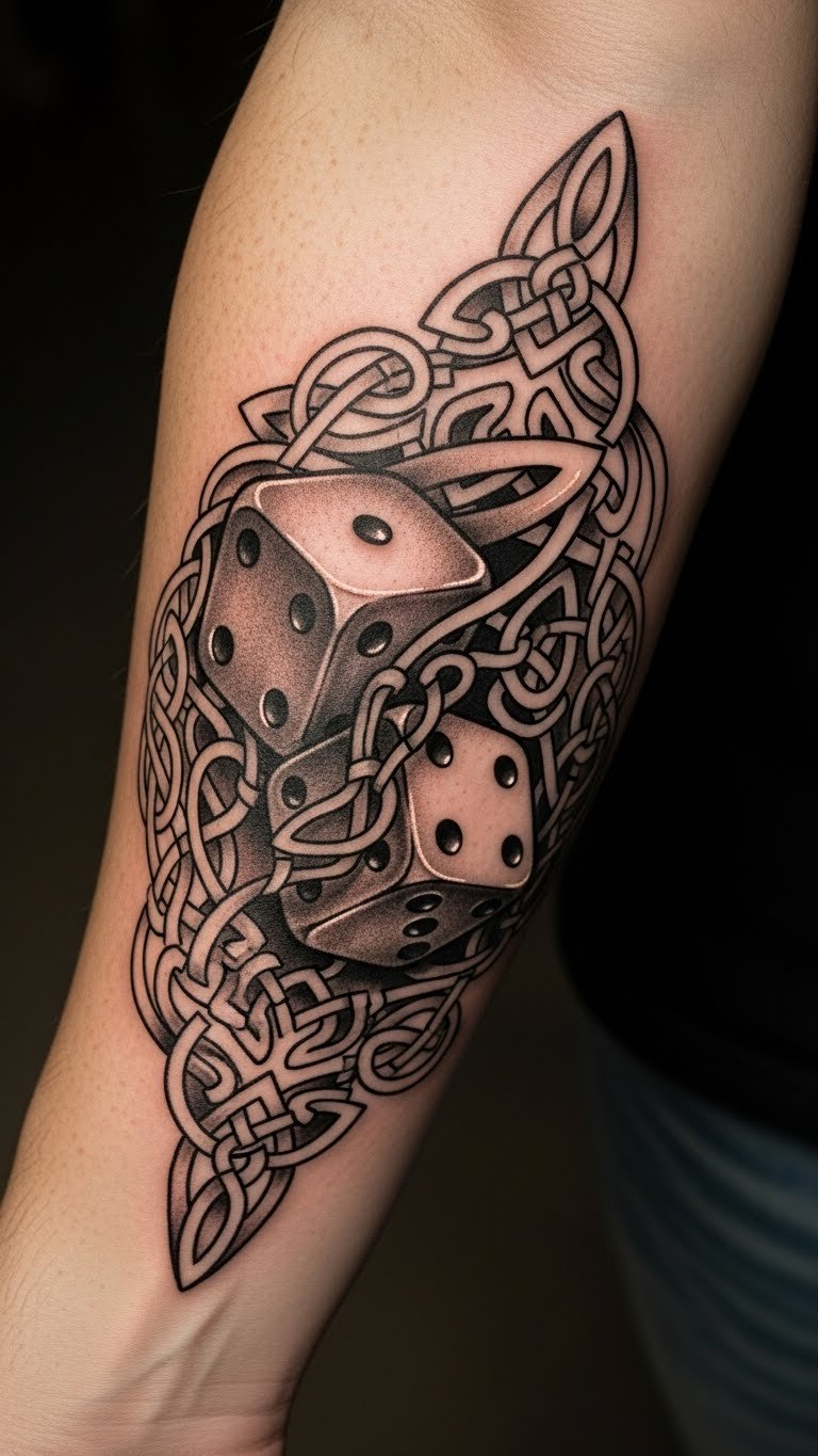 The tattoo symbolizes the union of fate and cultural heritage, blending the excitement of chance with the timeless beauty of Celtic artistry.