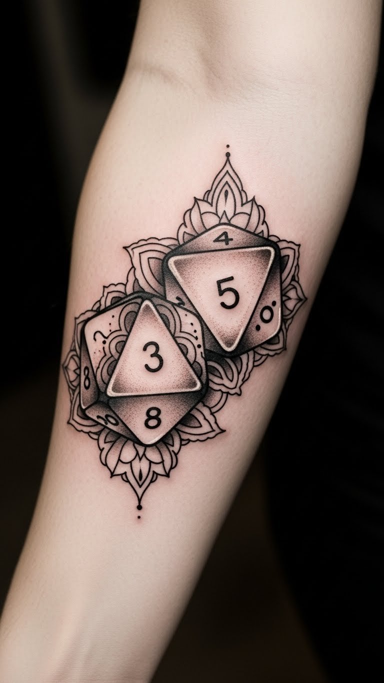 This tattoo symbolizes the intertwining of fate and fantasy, with the dragon representing strength and wisdom, while the dice embody chance and adventure.