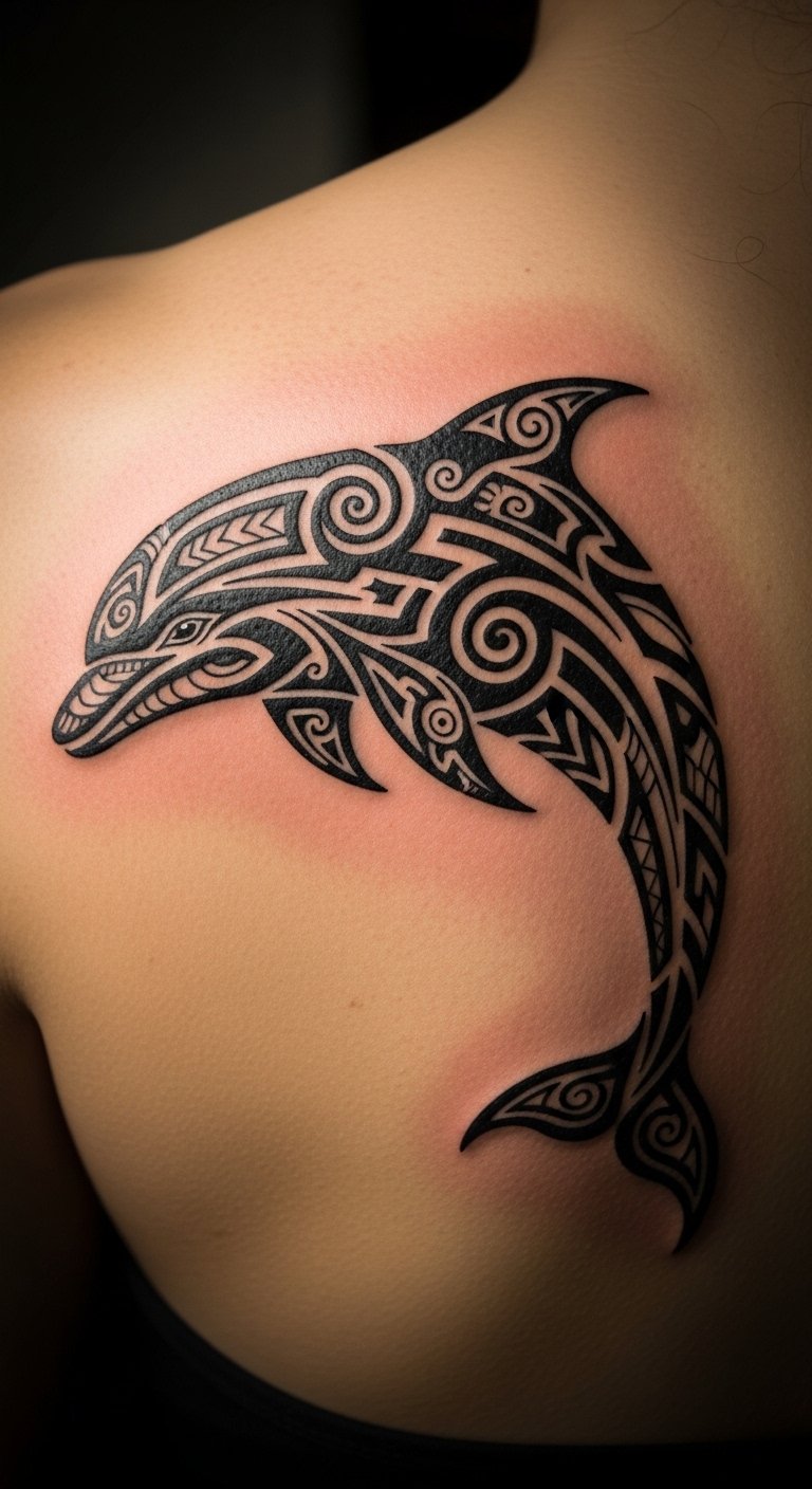 The intricate tribal patterns wrap around the dolphin, representing freedom and a deep connection to nature.