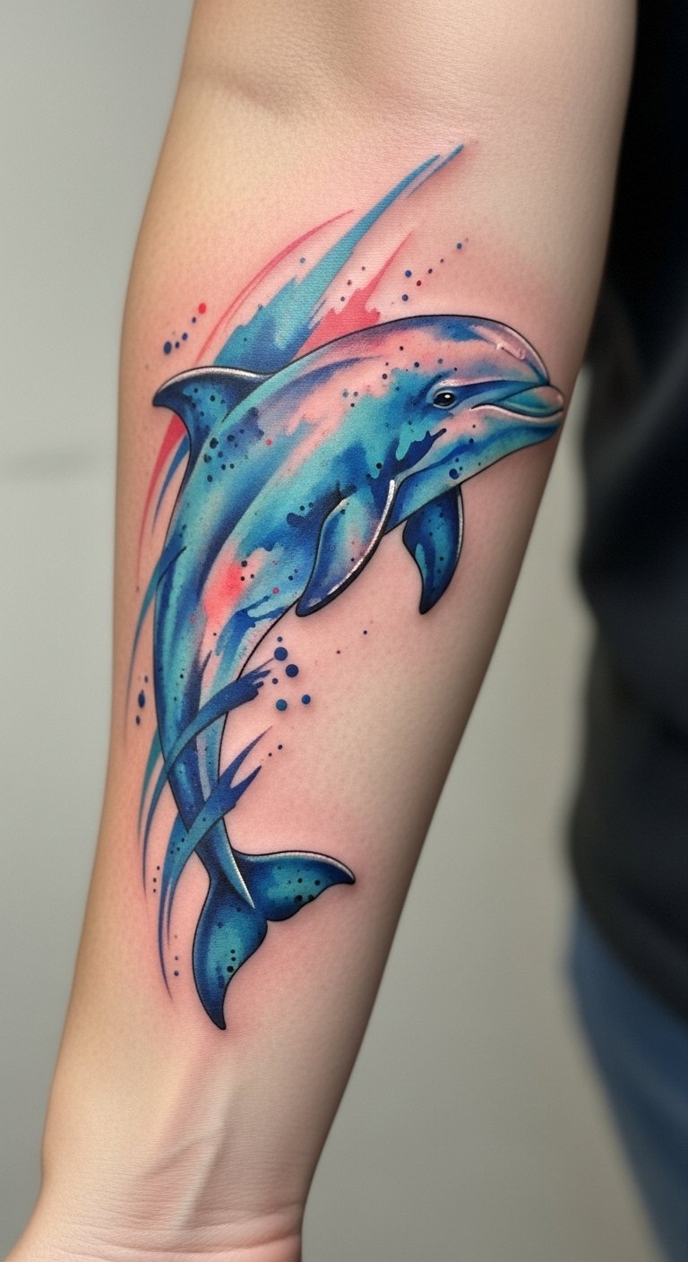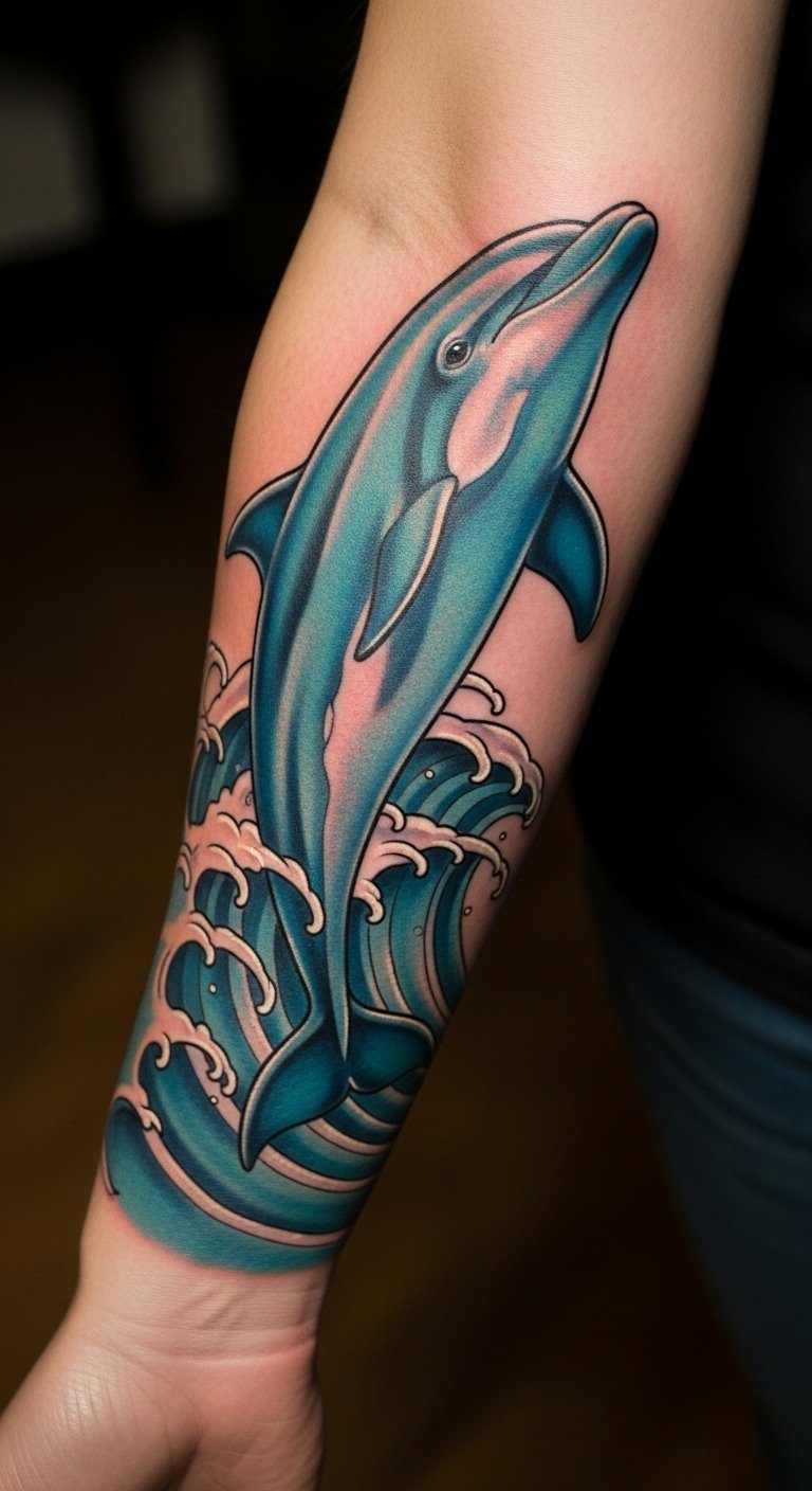 Positioned on the forearm, it serves as a daily reminder of the wearer’s love for dolphins and their spirited nature.