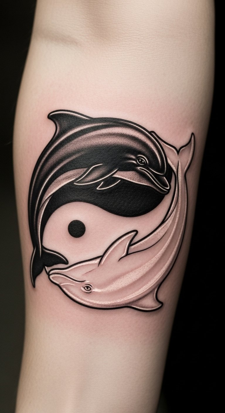 This tattoo embodies the essence of balance and harmony through the graceful interplay of the dolphins, symbolizing the yin yang philosophy.