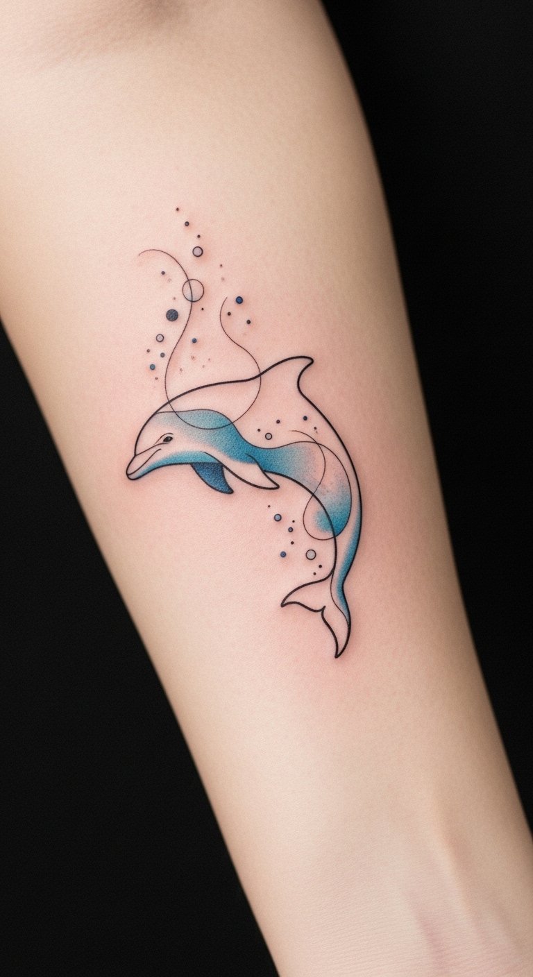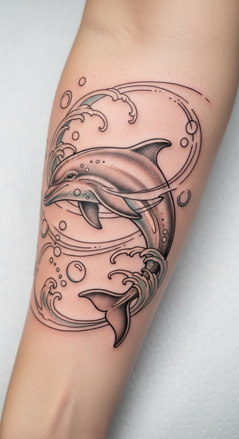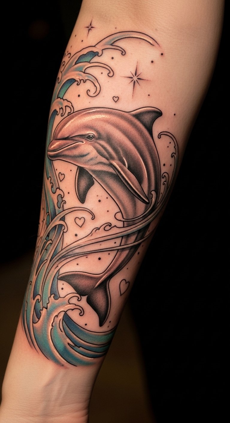 Positioned on the forearm, it allows for visibility and easy sharing of its meaning. The dolphin embodies parental love and sibling ties, representing protection and emotional closeness.