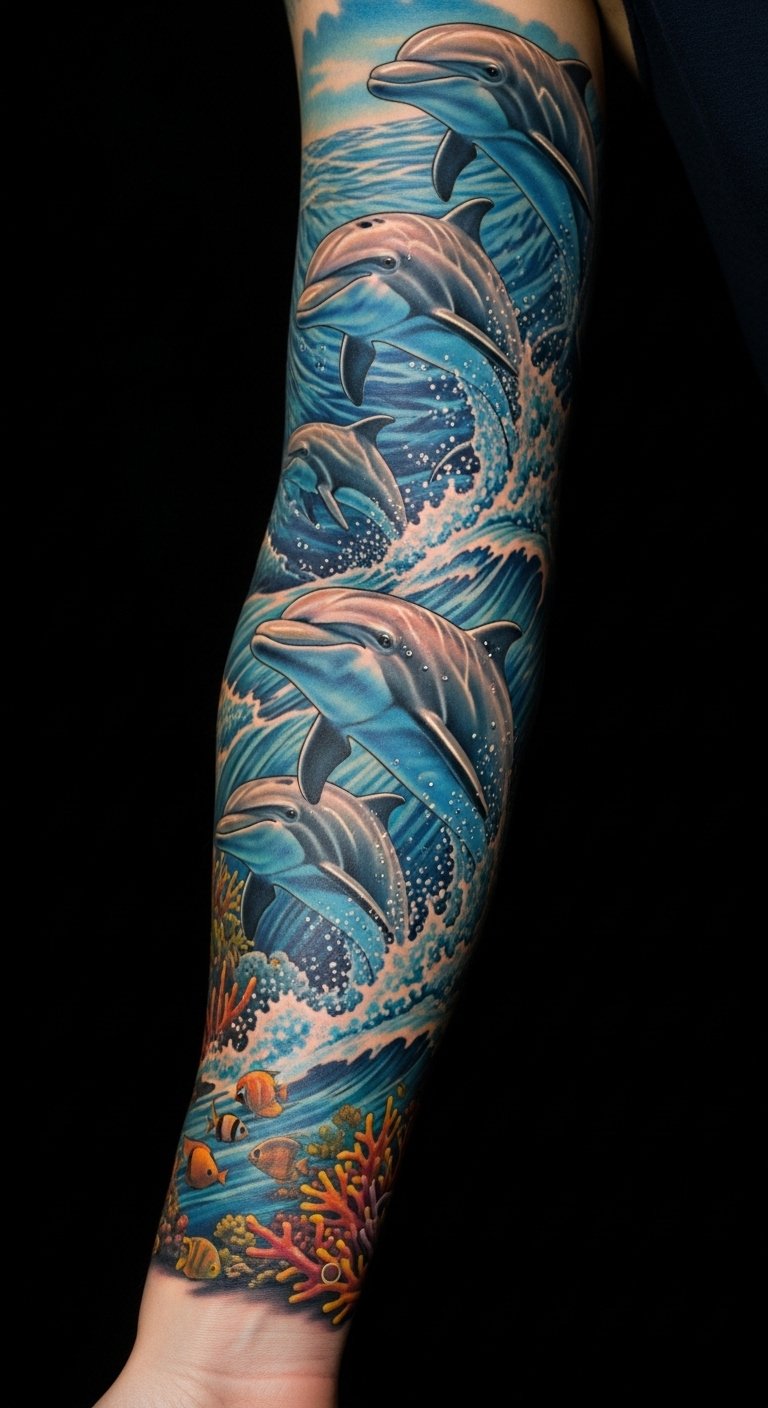 Large-Scale Dolphin Sleeve Tattoos
