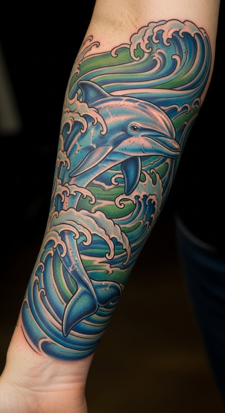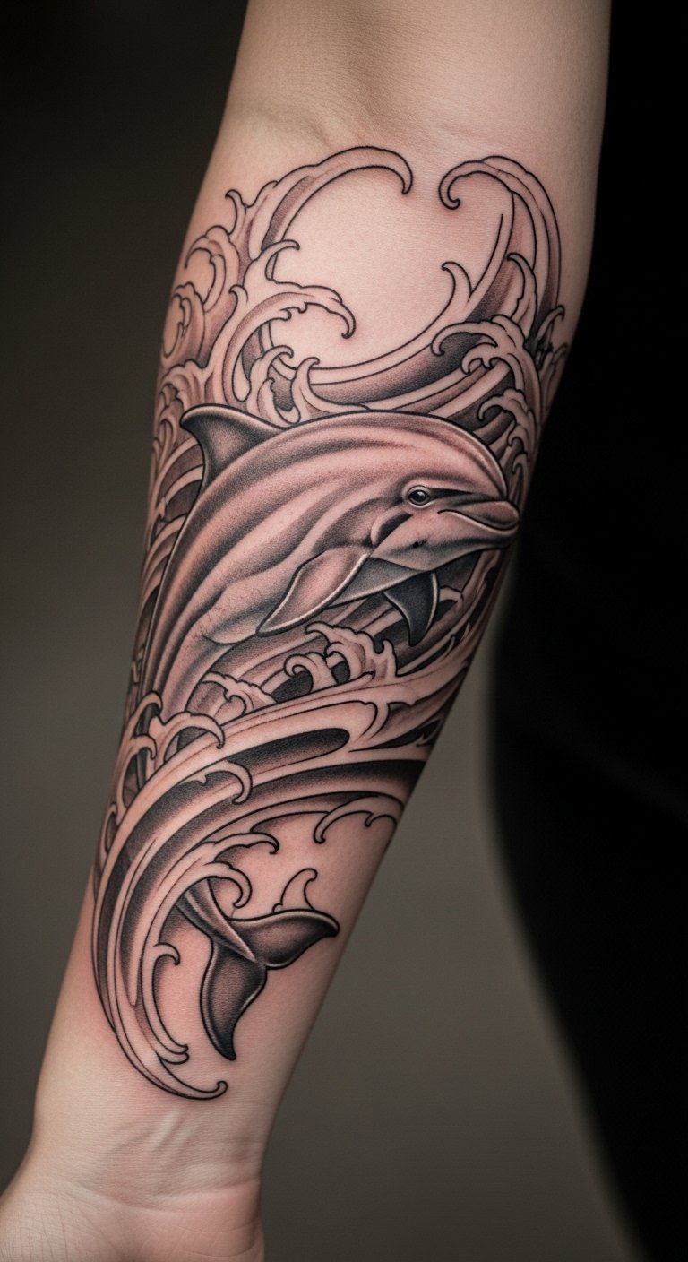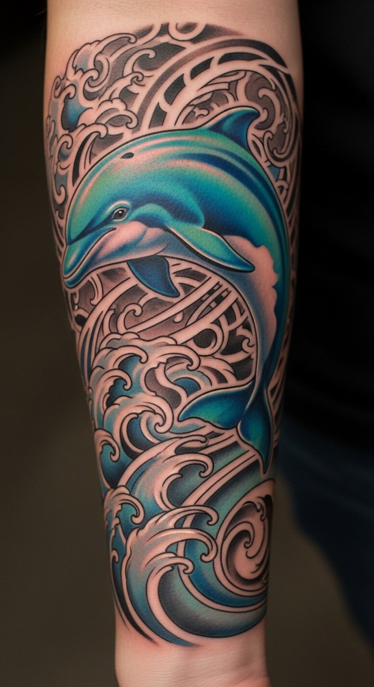 Intricate Dolphin and Wave Tattoos