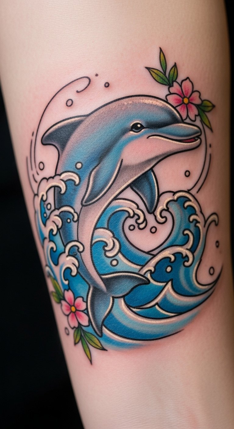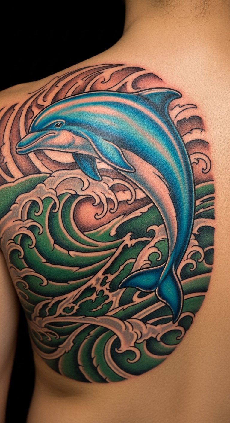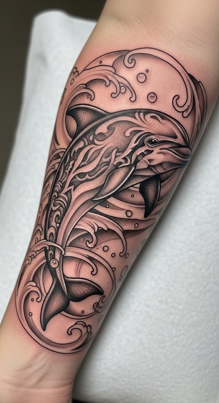 Intricate Dolphin and Wave Tattoos