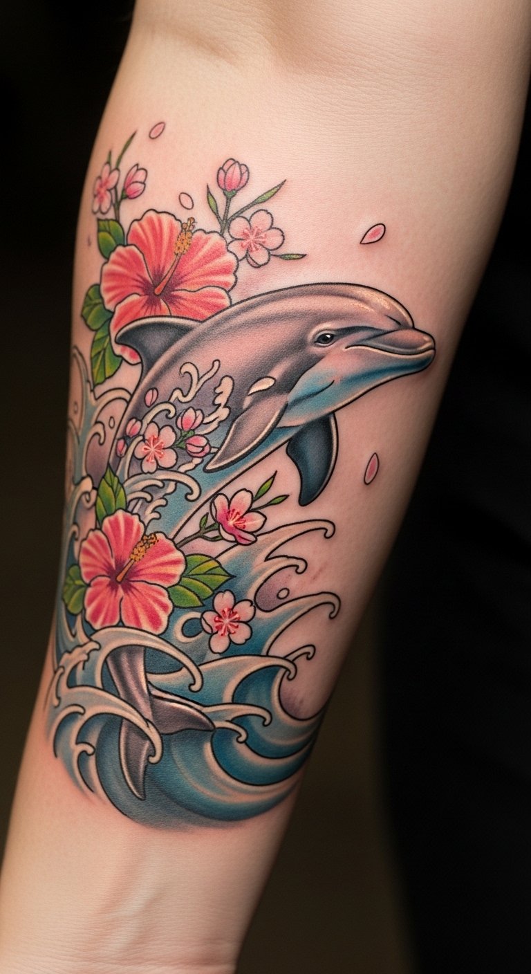Dolphin Tattoos With Floral Elements