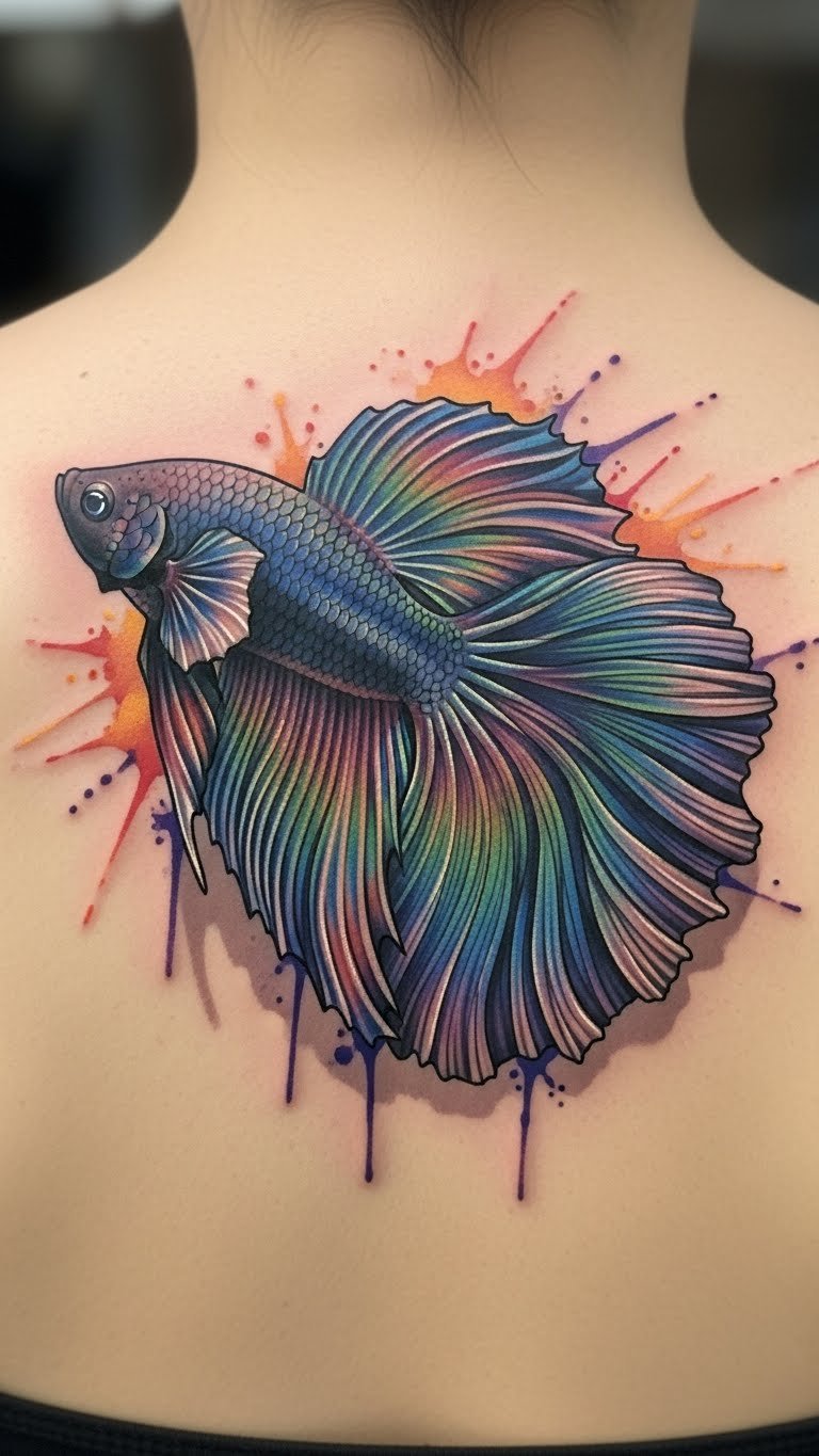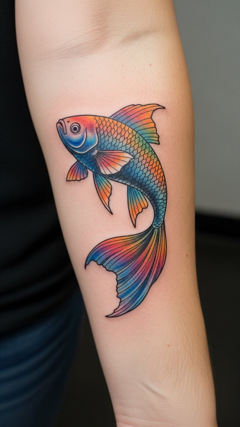 This colorful fish tattoo symbolizes freedom and personal growth, embodying the wearer’s passion for life and emotional expression.