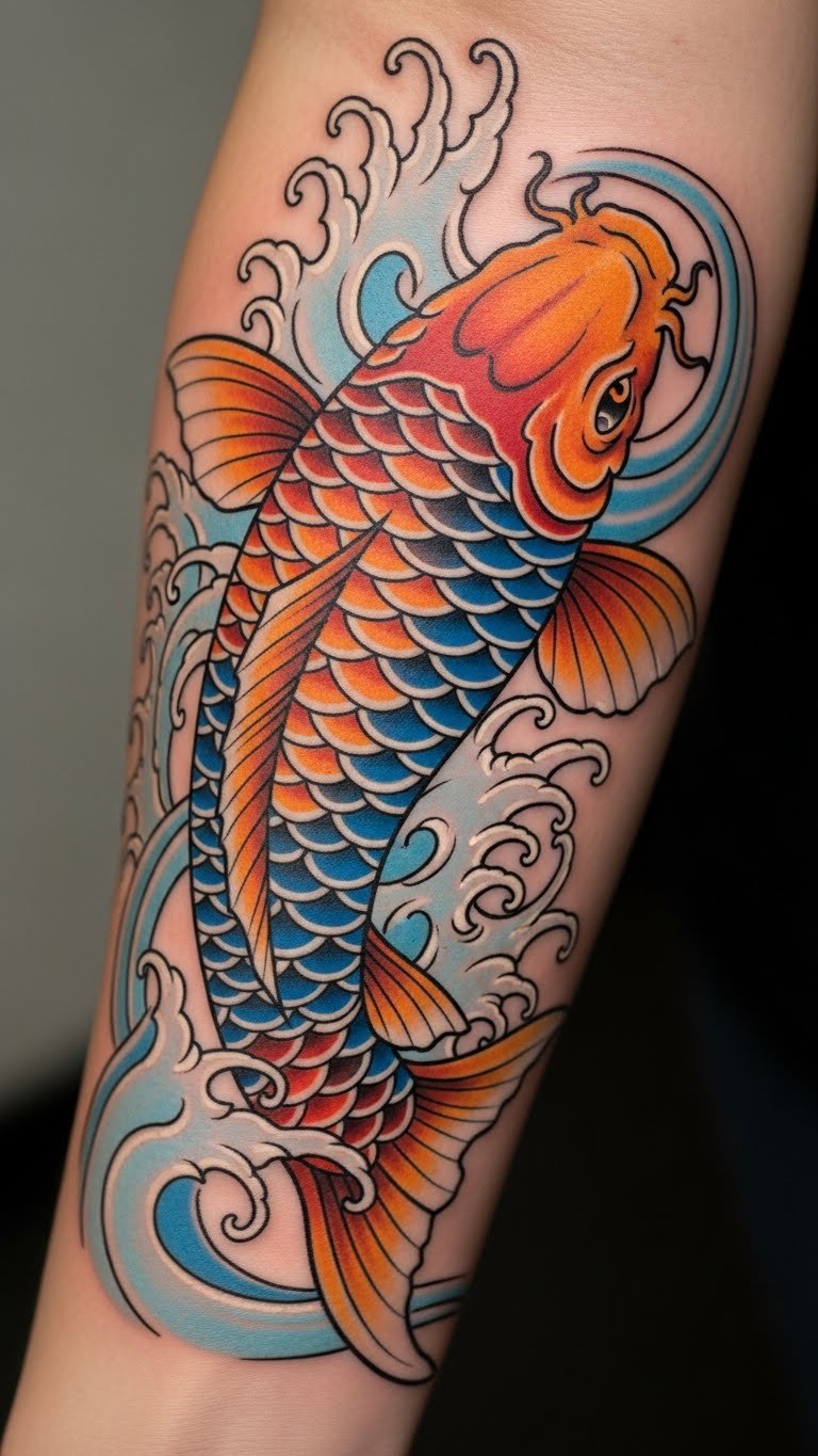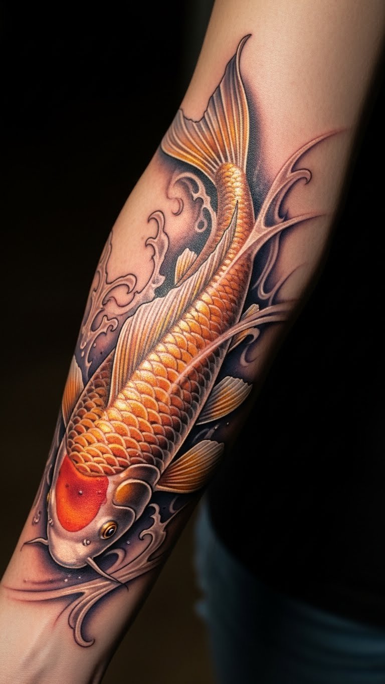 The koi tattoo on the forearm serves as a powerful symbol of resilience and transformation, embodying the journey of overcoming challenges.