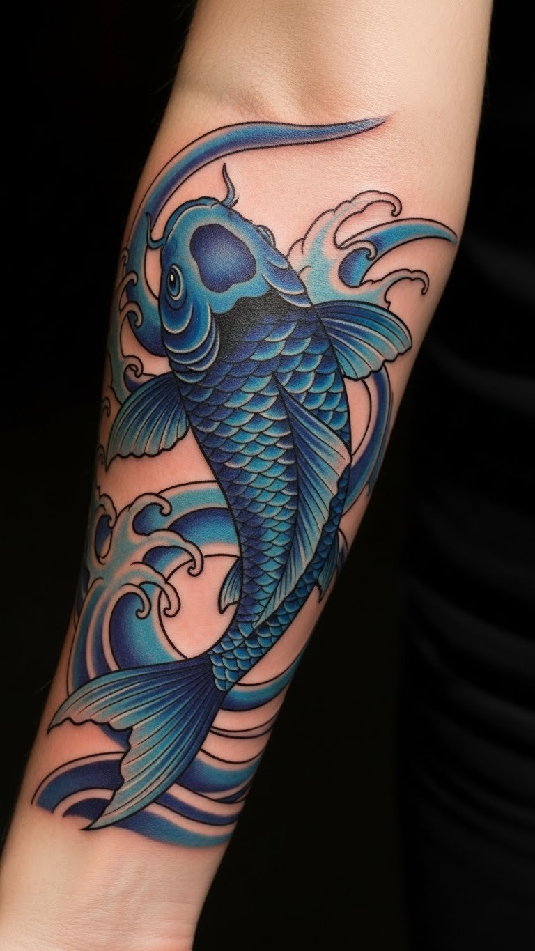 The blue koi tattoo symbolizes tranquility and peace, reflecting a poignant journey through life’s challenges.