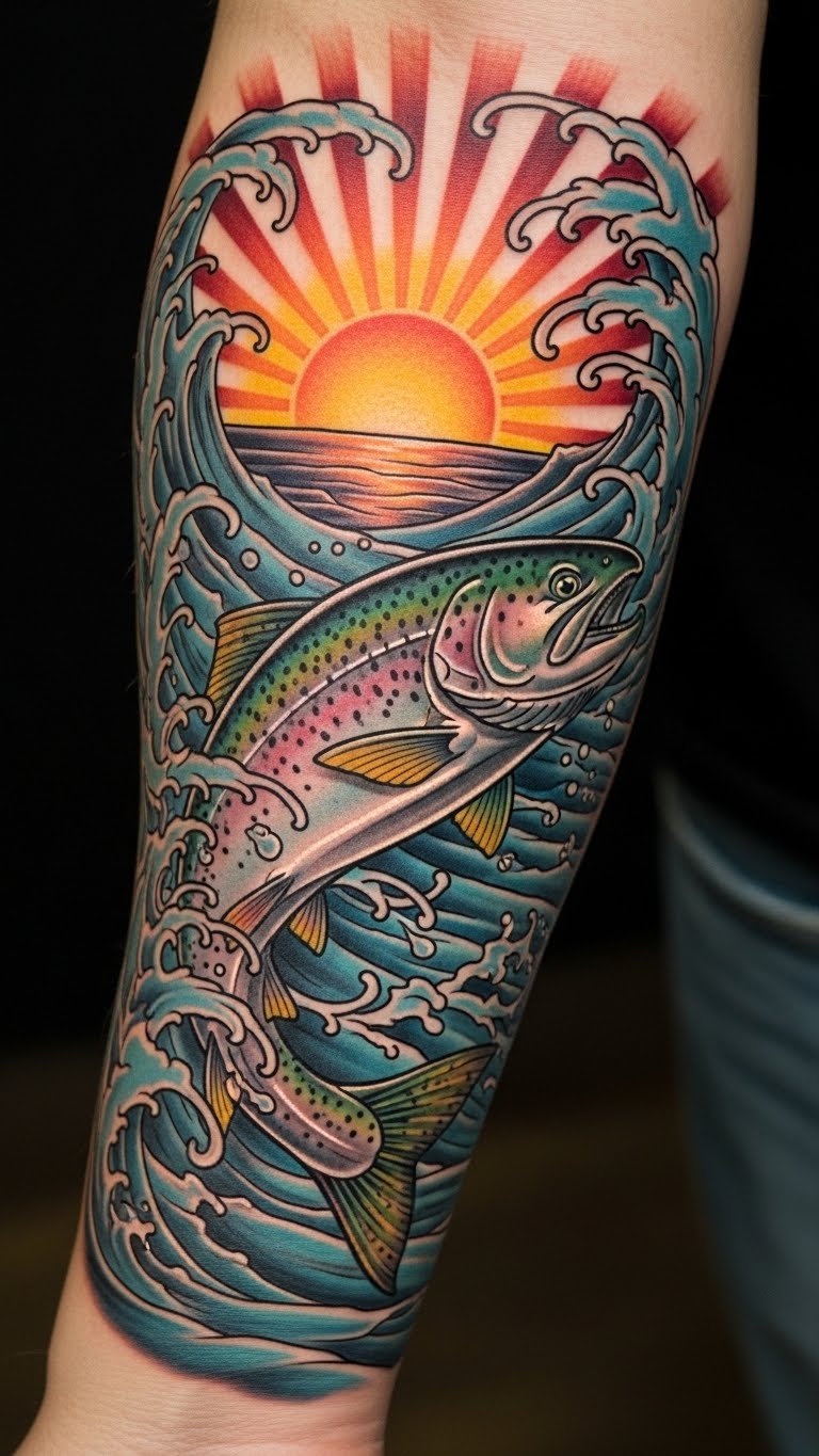 This tattoo captures the essence of personal journeys, representing the resilience and healing that comes from love and loss. The leaping fish symbolizes freedom and the quest for growth, while the waves evoke the ever-changing nature of life.