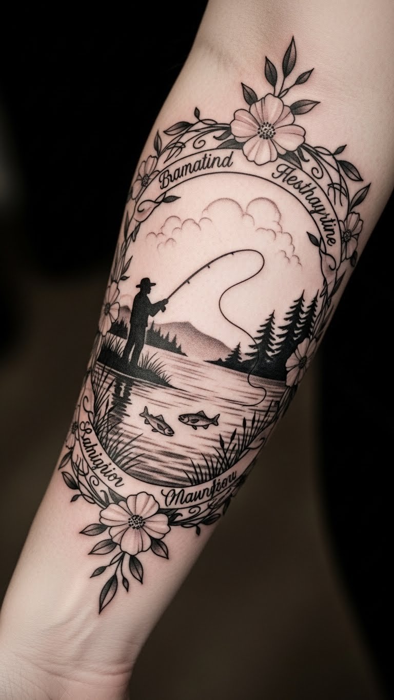 The fishing scene symbolizes patience, connection, and the journey through life, while the floral elements represent the beauty of growth and remembrance.