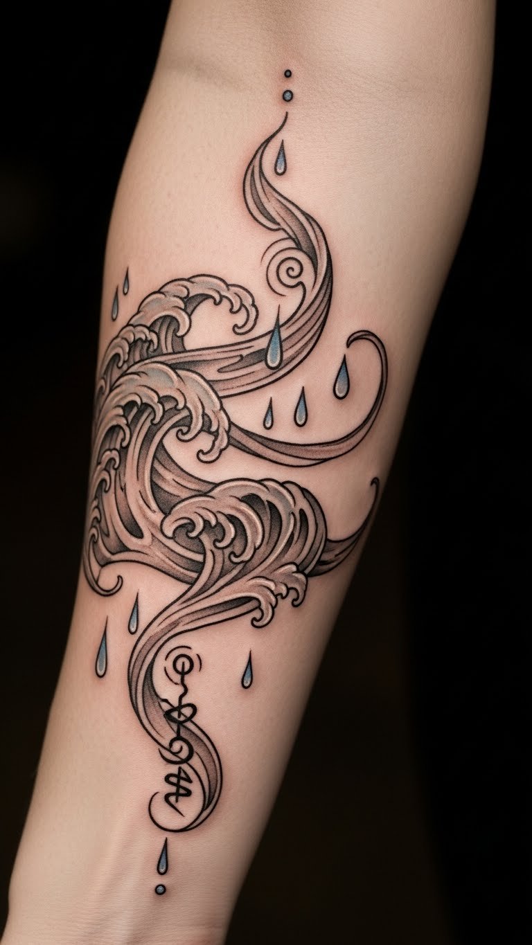 Positioned on the forearm, it serves as a constant reminder of one’s connection to nature and the emotional waters navigated throughout life. This placement allows for easy visibility, inviting conversations and reflections on shared experiences, strengthening community ties and personal identity.