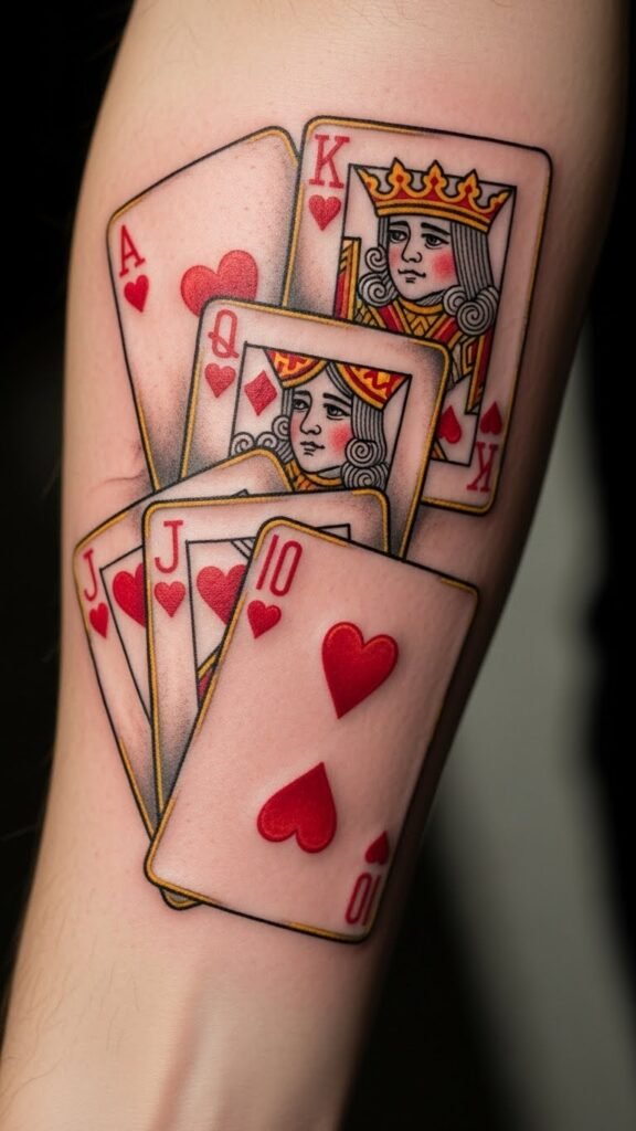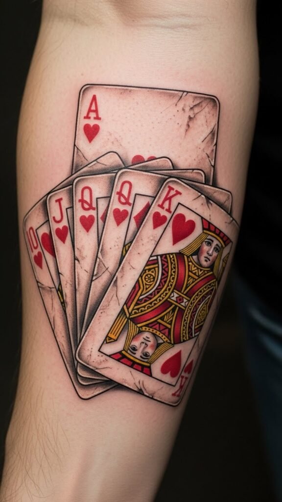 The royal flush tattoo symbolizes the pinnacle of success and fortune, embodying a moment of triumph in the world of gambling.