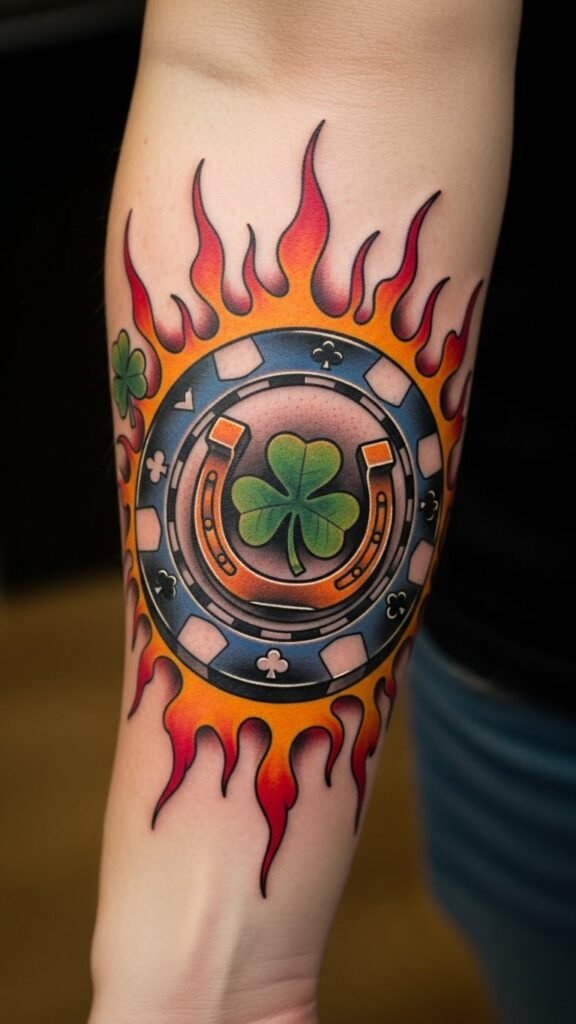 Positioned on the forearm, this design allows for easy visibility, making it a striking statement piece that reflects personal passion and a bold personality, inviting conversations about luck and life’s adventures.