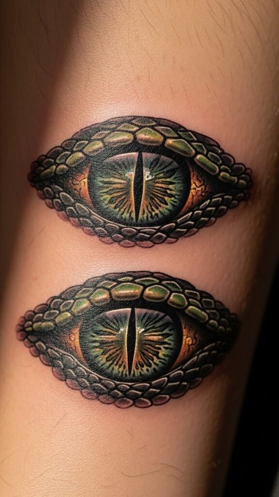The snake eyes tattoo symbolizes the duality of bad luck and resilience, embodying the wearer’s journey through life’s challenges.