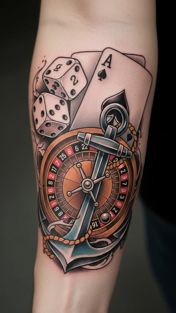 The dice and playing card signify chance and the thrill of gambling, while the anchor offers a sense of grounding amidst life’s unpredictability.