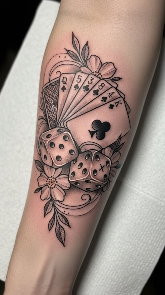 This tattoo concept embodies the thrill of gambling culture, with the dice symbolizing chance and luck, while the cards reflect strategy and decision-making.