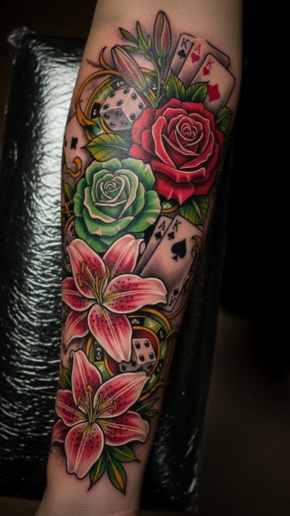 This tattoo design symbolizes the duality of life, blending the thrill of gambling with the beauty of nature. The roses and lilies represent luck and prosperity, while the gambling symbols signify the risks we take in pursuit of our dreams.