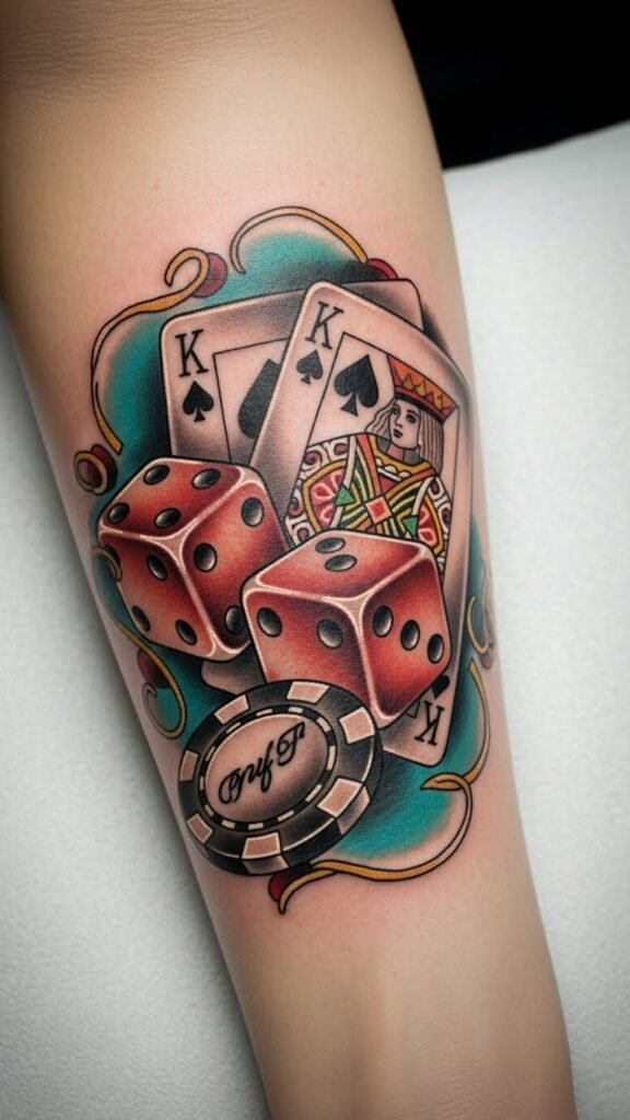 This tattoo represents a personal philosophy of risk and luck, capturing the essence of gambling and chance. The dice symbolize the unpredictability of life, while the cards reflect strategic choices and community connections.