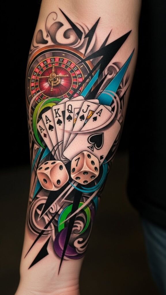 This tattoo on the forearm symbolizes the balance of risk and reward, embodying the thrill of gambling while celebrating personal narratives.