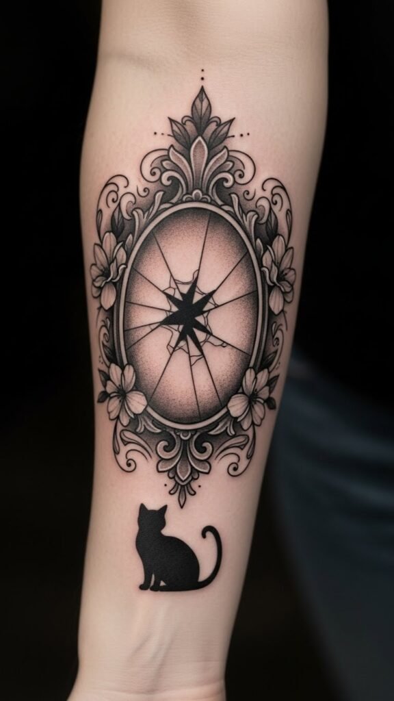 The broken mirror represents self-reflection and the recognition of flaws, while the black cat, often seen as a harbinger of bad luck, serves as a reminder to find strength in adversity.