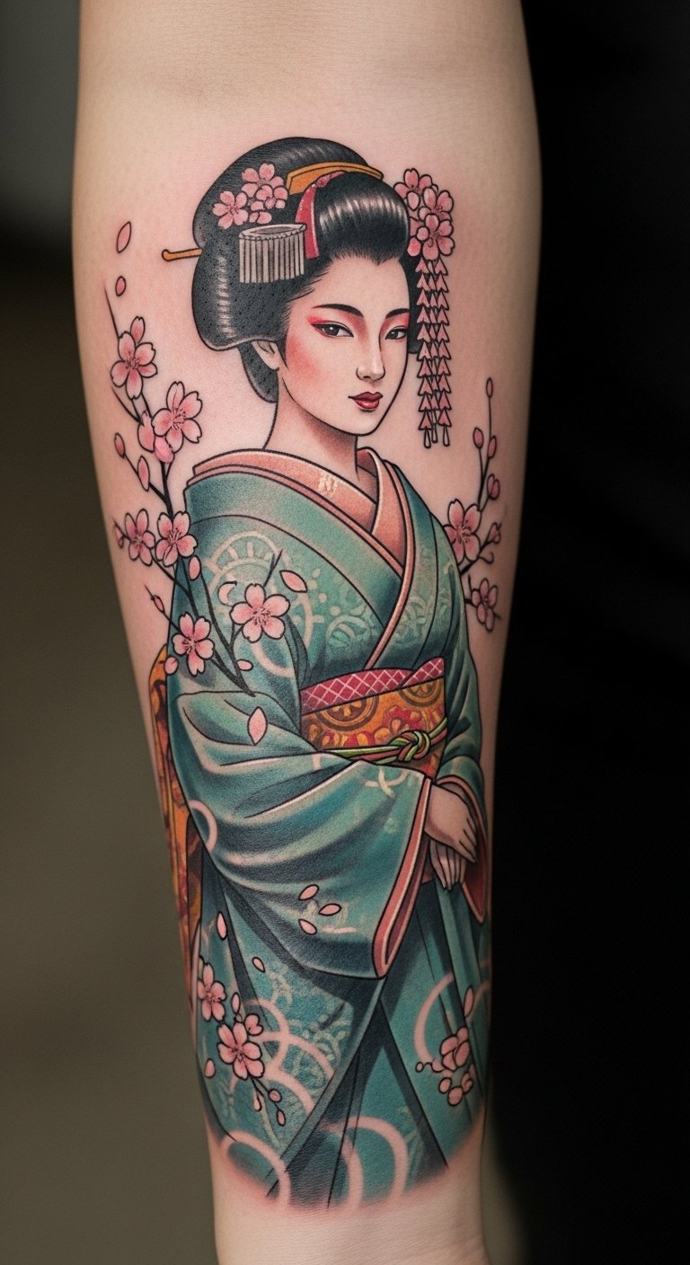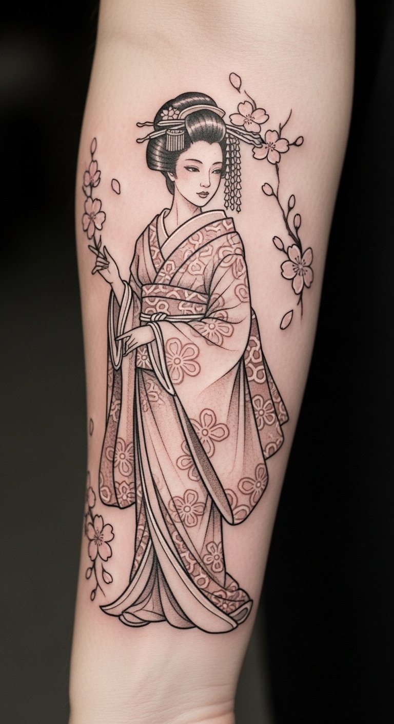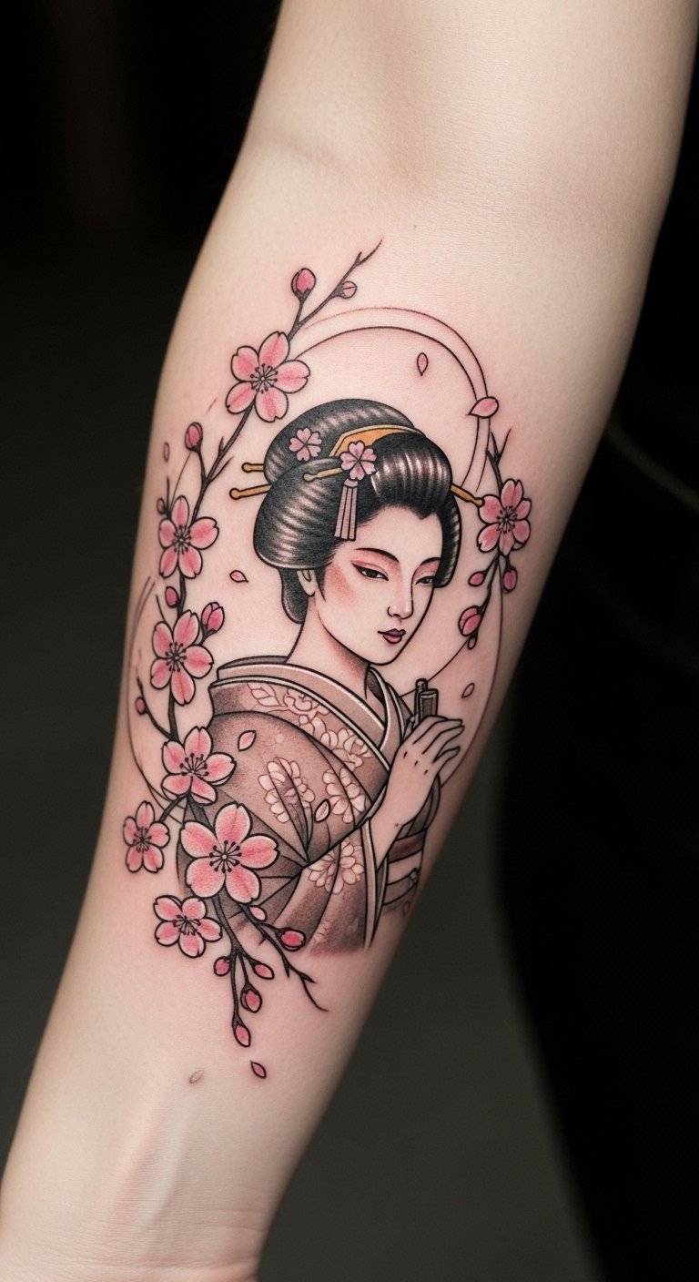 Positioned on the forearm, it serves as a constant reminder of personal empowerment and cultural appreciation. The geisha symbolizes grace, while the cherry blossoms signify beauty and transience, together inspiring freedom and individuality in today’s world.