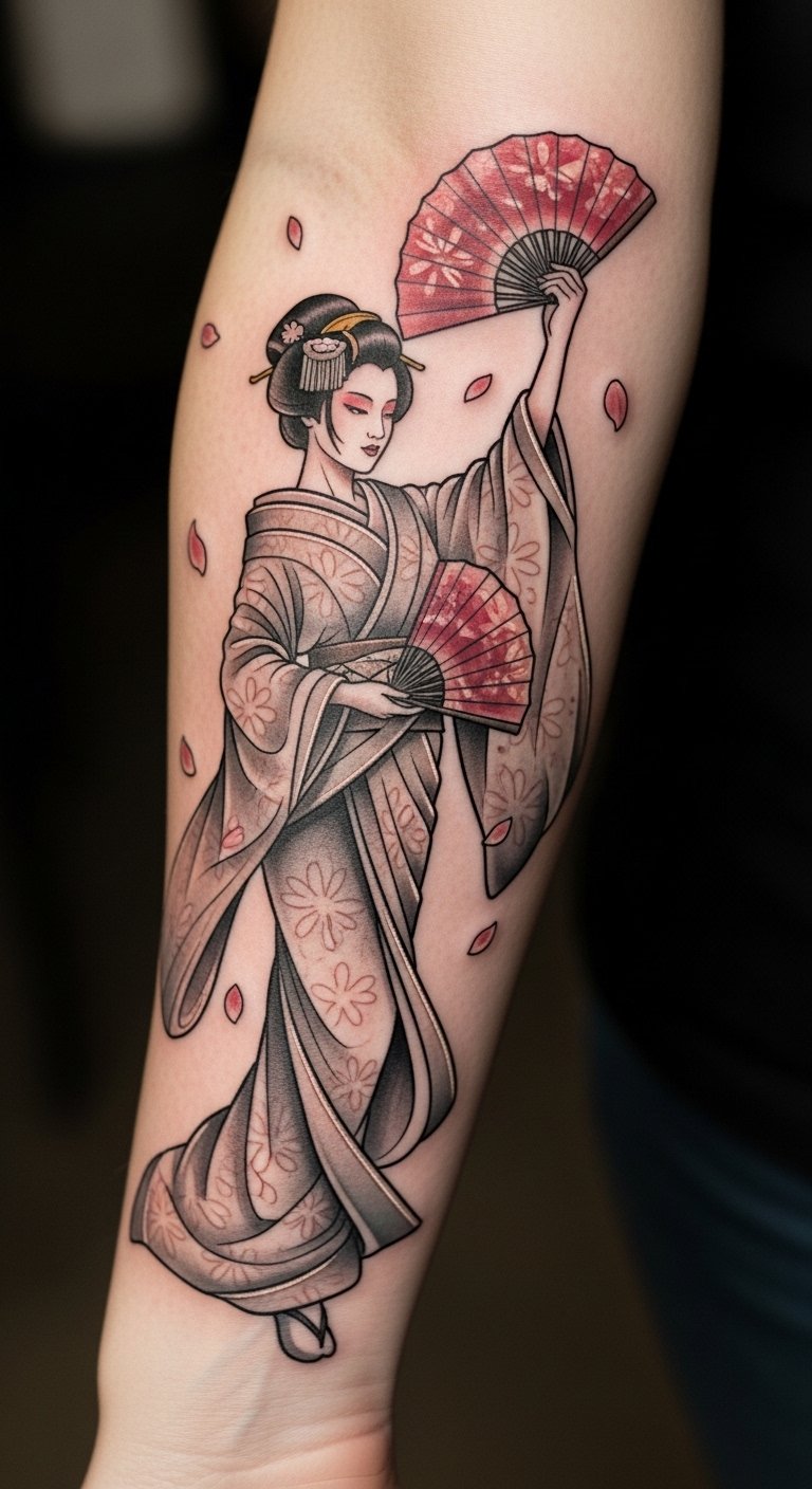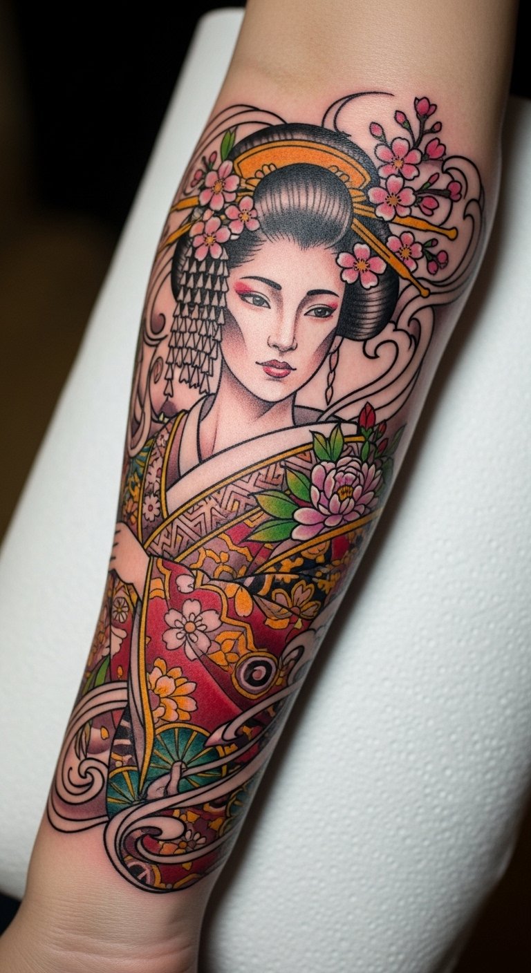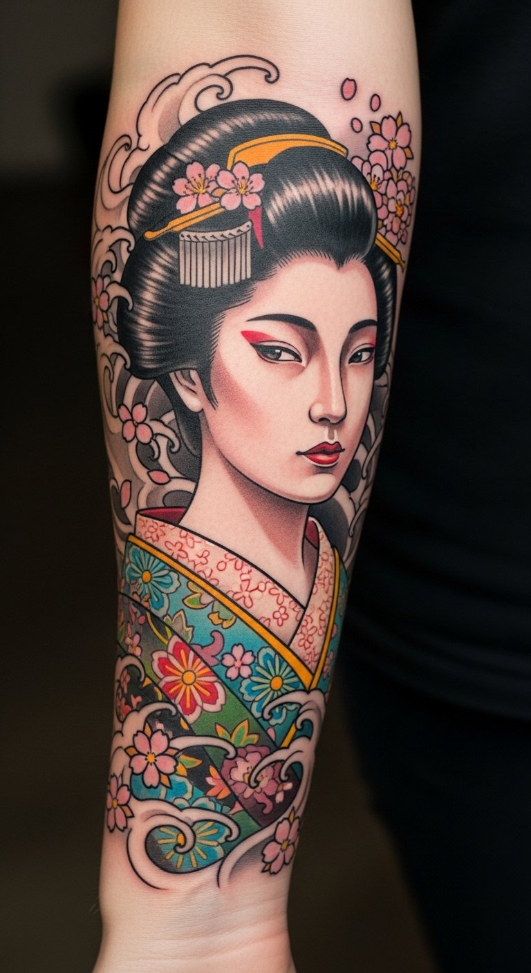 The geisha tattoo on the forearm embodies a powerful narrative of inner strength and resilience.