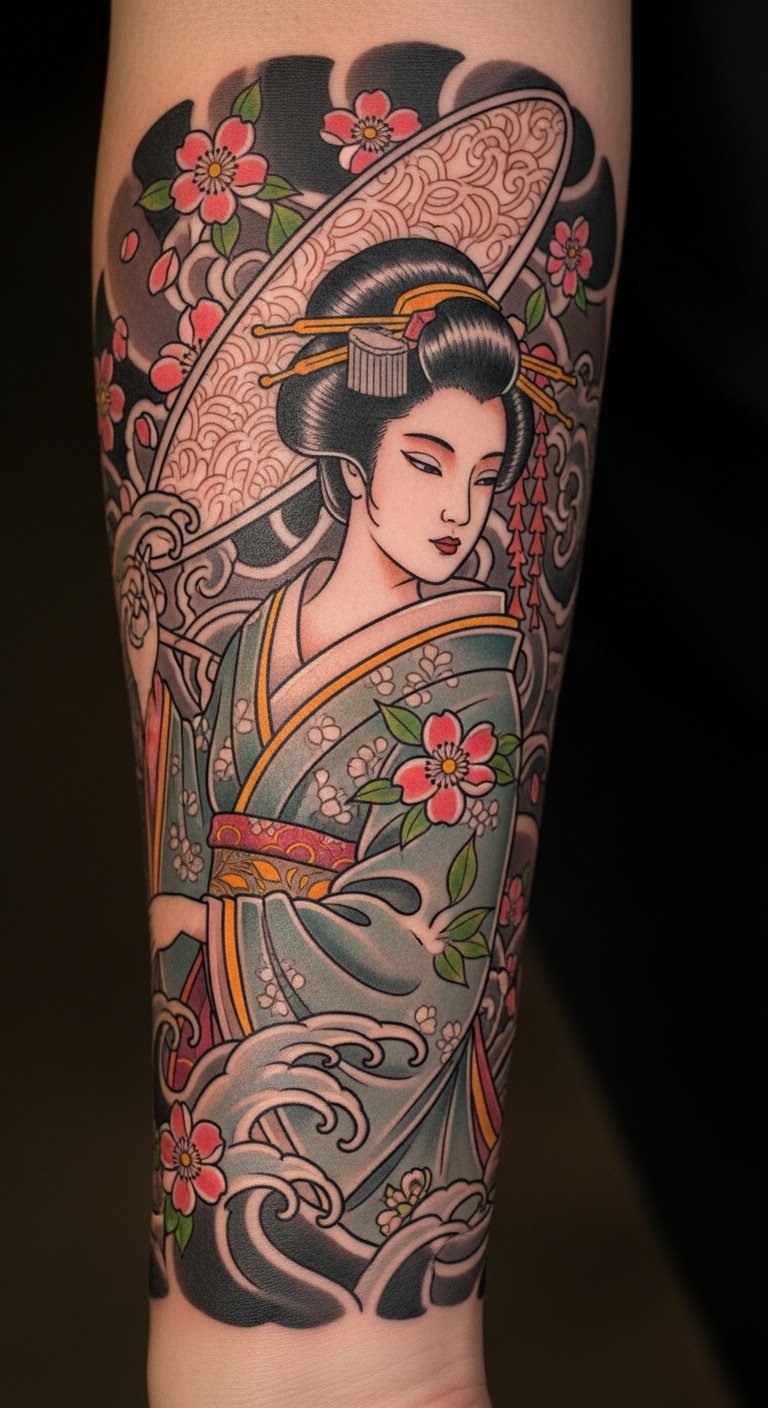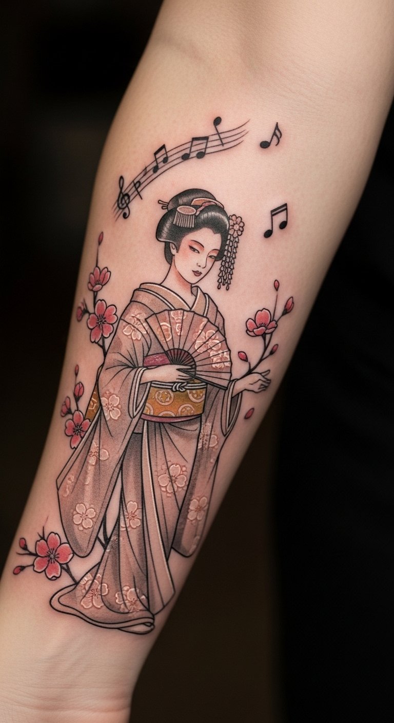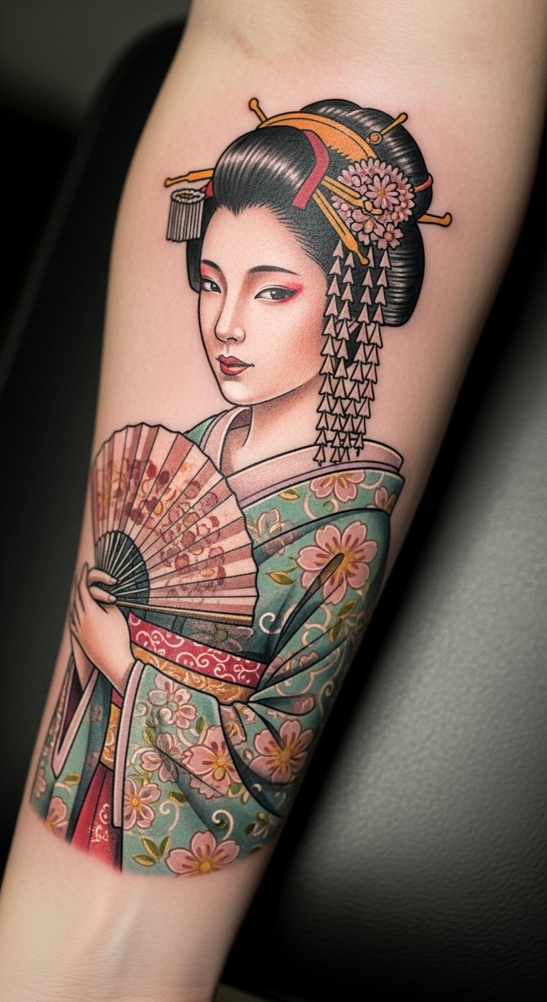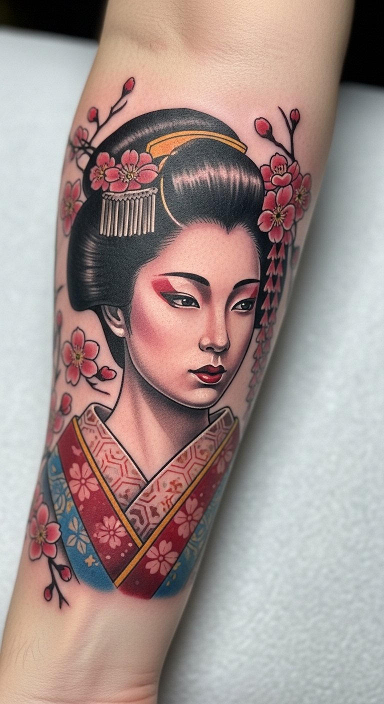 This tattoo symbolizes elegance, tradition, and the rich cultural heritage of Japan. It evokes emotions of admiration and respect for artistry while serving as a personal expression of one’s appreciation for beauty and history.